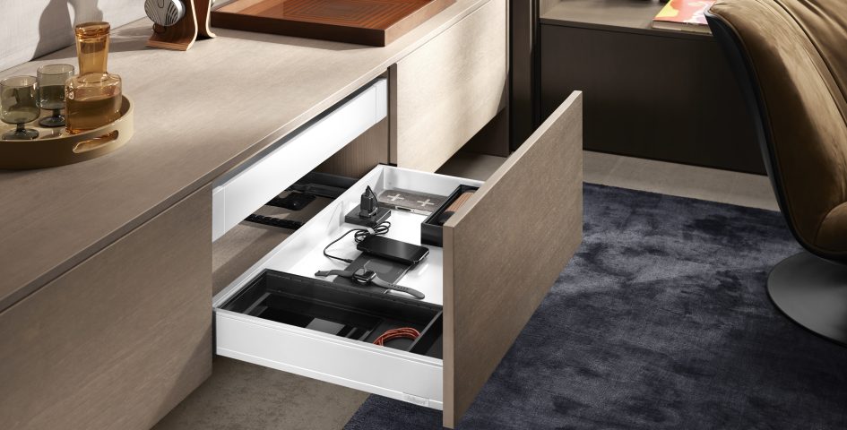 Mit „elektrifizierten“ Möbeln fällt so manches leichter: Zum Beispiel die Stromversorgung elektrischer Geräte im Haushalt. Oder das Öffnen von schweren Schubladen, breiten Klappen und Einbaugeräten in der Küche. Für beides hat das österreichische Unternehmen Blum clevere Lösungen parat: Die Möbelsteckdose AMPEROS AC und die elektronische Öffnungsunterstützung SERVO-DRIVE.