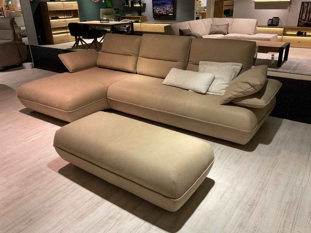 BemerkungBezug Leder A-India, Fb. Jade, incl. Kopfteil-, Armteil- und Sitztiefenverstellung, ca. 319 x 211 cm + Hockerbank ca. 130 x 60 cm, 1x Nierenkissen ca. 70 x 23 cm, Flatterkissen ca. 52 x 52 cm,