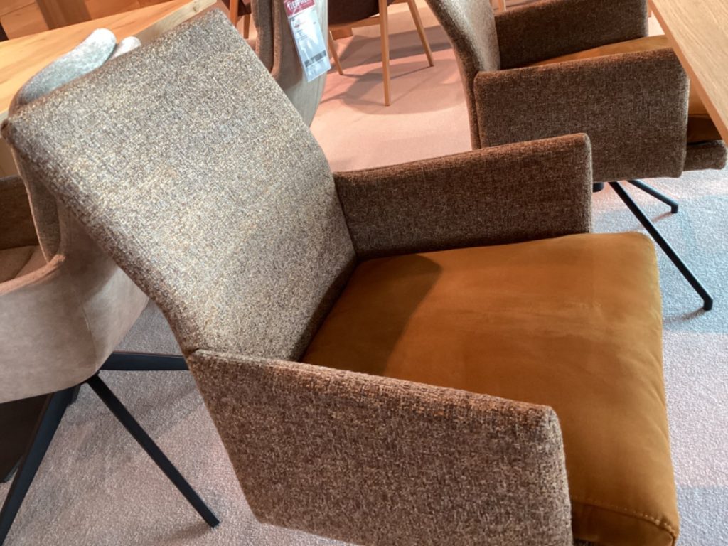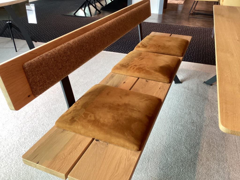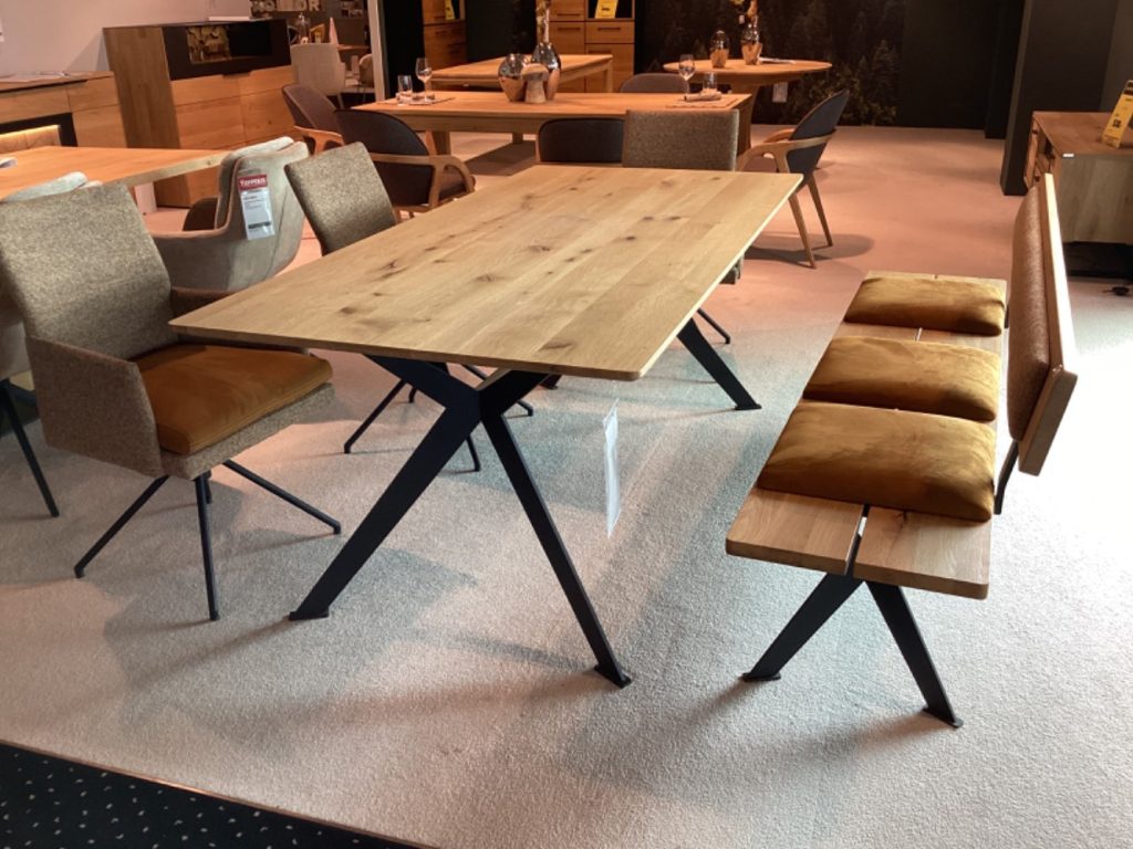 Wildeiche Esstisch ca. 200x95cm, Bank, 3x Armlehnstuhl/Drehfunktion — Stoff