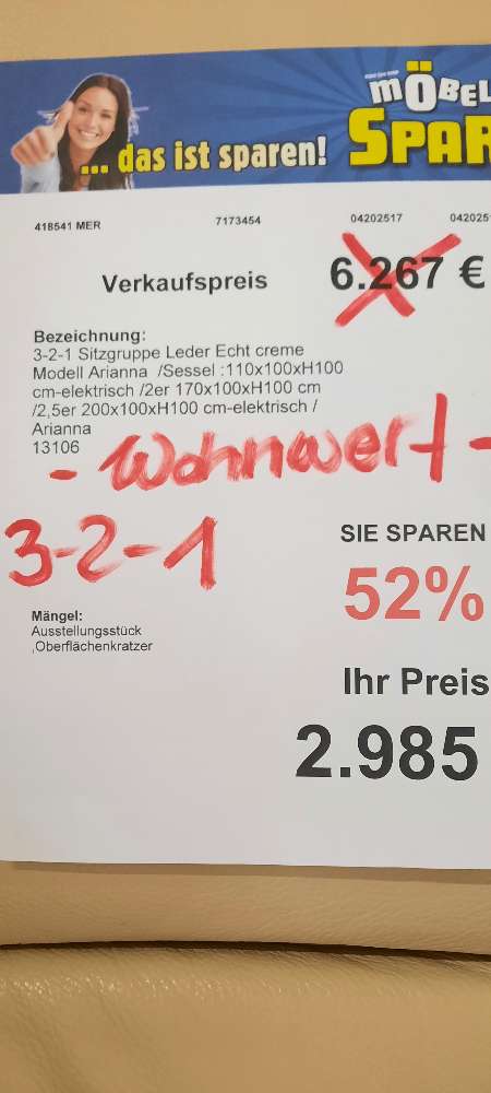 ModellHierbei handelt es sich um ein Angebot von Möbel Spar.Standort des Artikels ist Merseburg.Details wie technische Daten (Maße etc)oder Schäden entnehmen Sie dem Bild mit Preisschild Bei einem längeren Anfahrtsweg und vorheriger Absprache mit der Verkäuferin vor Ort ist eine Reservierung, für die Dauer der Fahrt maximal jedoch für 4 Stunden möglich. Von Sonderanfragen bitten wir abzusehen. Versand /Lieferung/Transport: Ist nach telefonischer Absprache je nach Entfernung und Aufwand gegen Aufpreis möglich Sprechen Sie uns an Umlagerung: Sie haben einen Artikel entdeckt welcher in einer anderen Filiale als Ihre nächstgelegene lagert? Kein Problem, wir bieten eine interne Umlagerung an. In diesem Fall muss der Kunde eine Anzahlung in dem Abholmarkt tätigen. Je nach Größe und Aufwand kann eine individuelle Transfergebühr berechnet werden. Der Kauf ist keine Pflicht, es wird aber bei Nichtgefallen und Wegfall des Verkaufes eine pauschale Bearbeitungsgebühr in Höhe von 15€ einbehalten, ebenso die ggf. angefallene Transfergebühr. WICHTIG: Bitte telefonisch erfragen ob der Wunschartikel noch verfügbar ist. Zwischenverkauf vorbehalten. Die Besichtigung, der Verkauf und die Abholung erfolgt ausschließlich bei unserem Handelspartner: MÖBEL SPAR GmbH 06217 Merseburg , Klobikauer Str.14( Einfahrt über Geusaer Tel: 0176 578 90 762 Festnetz: 03461 2756990