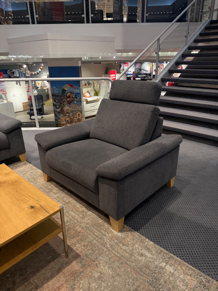Polstergarnitur in grauem Stoffbezug und sichtbarem Holzgestell