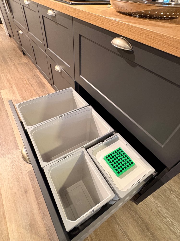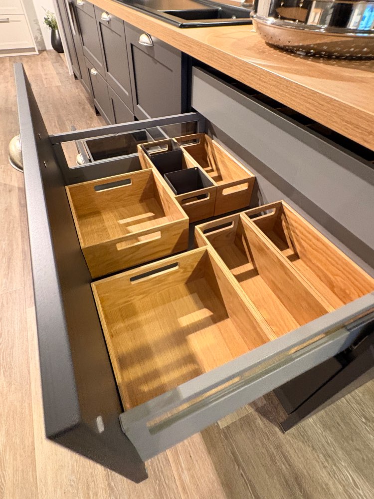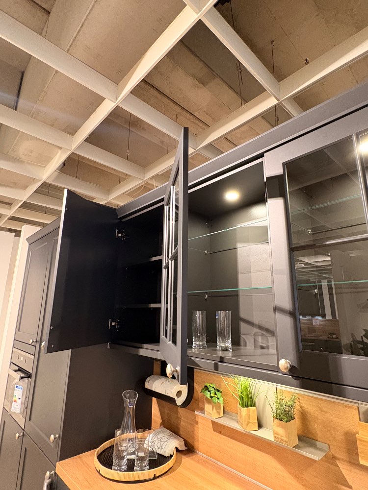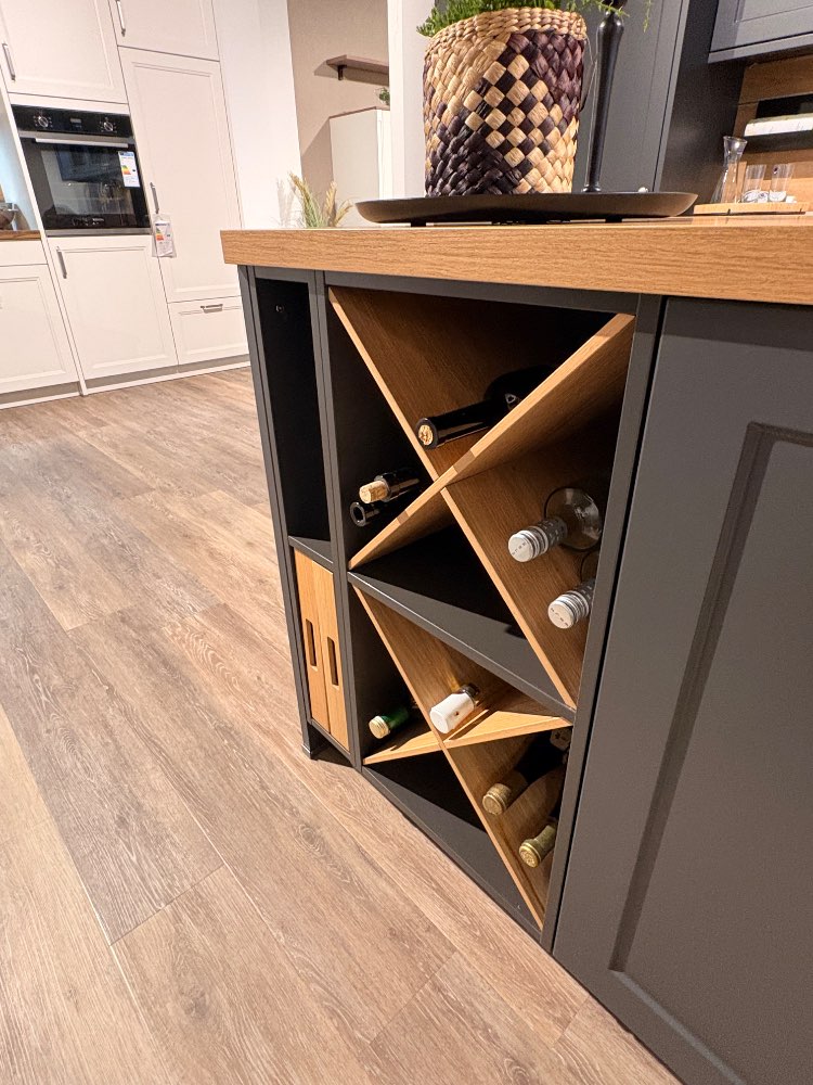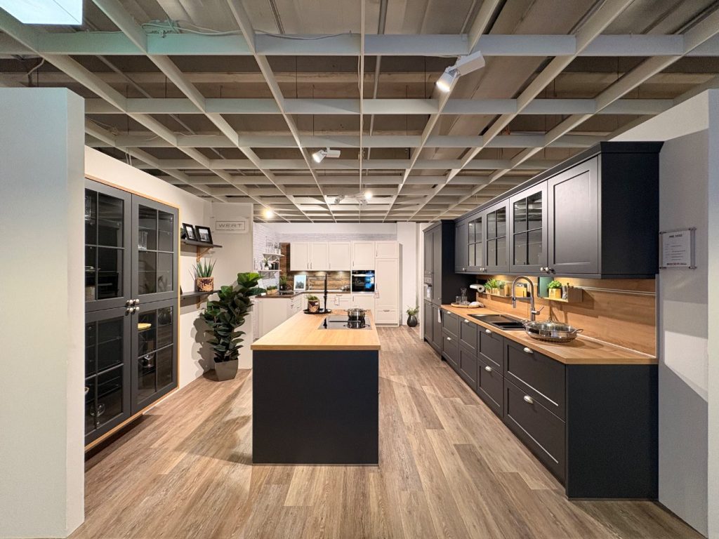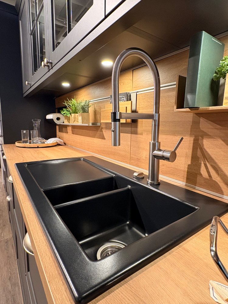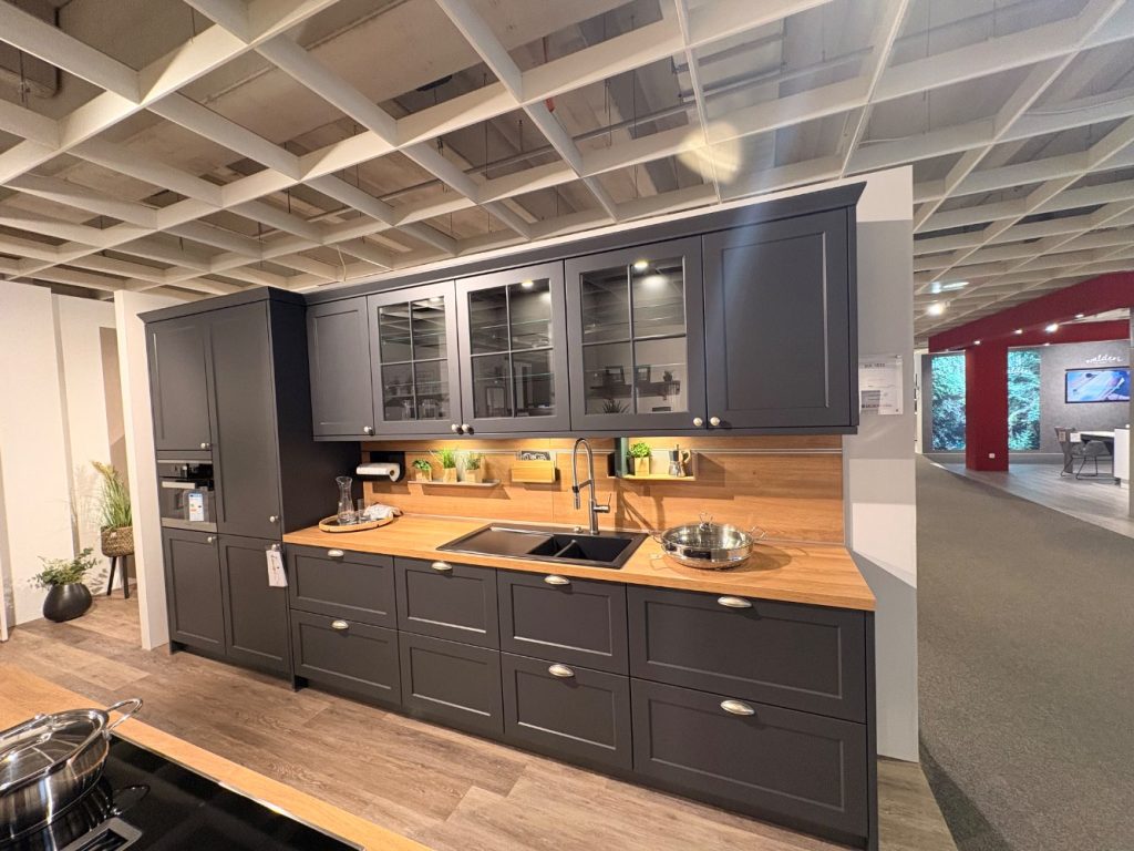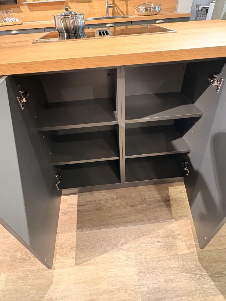 Bemerkung Die Küche Vivien von NOBILIA in Lavaschwarz ist ein beeindruckendes Beispiel moderner Eleganz gepaart mit funktionalem Design. Diese Ausstellungsküche überzeugt durch ihre durchdachte Struktur und hochwertige Materialien. Die klare Linienführung wird von der edlen Kombination aus Lavaschwarz und der warmen Ausstrahlung der Arbeitsplatte in Aurora Eiche NB harmonisch ergänzt. Mit einer großzügigen Zeile von 4075mm und einer einladenden Insel, die mit den Maßen 1950x990mm ausreichend Platz für gemeinsames Kochen oder gemütliches Beisammensein bietet, wird die Küche zum zentralen Treffpunkt in jedem Zuhause. Das Wandelement mit einer Breite von 2250mm bietet zusätzlichen Stauraum und sorgt für Ordnung. Die Fronten in Lavaschwarz sind elegant und zeitlos und werden durch die Griffe in Griffschale- und Knopf-Kombination stilvoll akzentuiert. Diese harmonische Mischung aus Form und Funktion macht Vivien zu einer erstklassigen Wahl für Liebhaber modernen Küchendesigns.