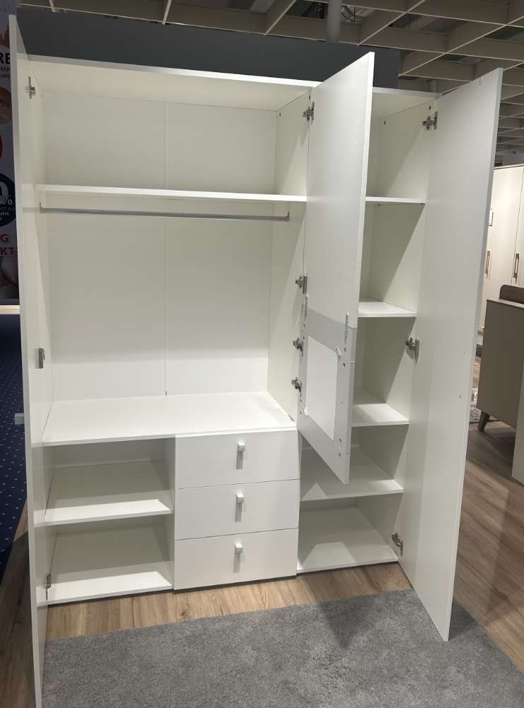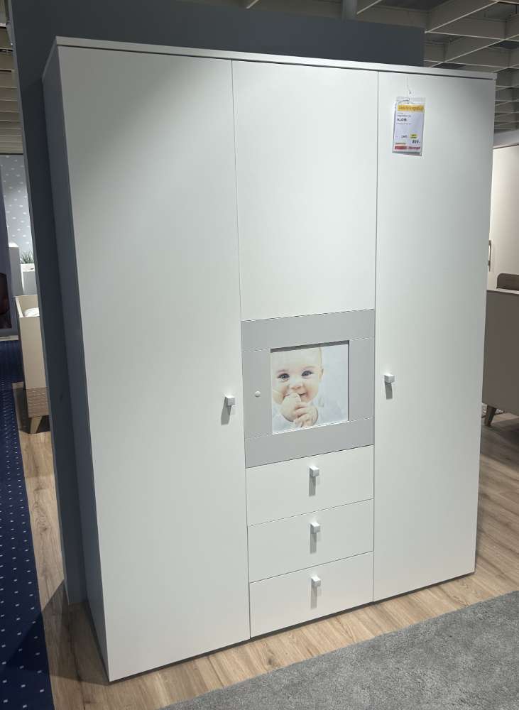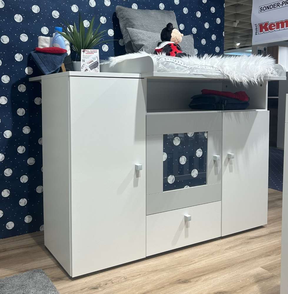 best. aus: - Babybett ca. 70x140 cm Liegefläche - Wickelkommode inkl. Wickelaufsatz ca. 127x102x77 cm B/H/T - Kleiderschrank ca. 147x192x51 cm B/H/T Kleiderschrank und Wickelkommode haben jeweils in der Front einen Bilderrahmen