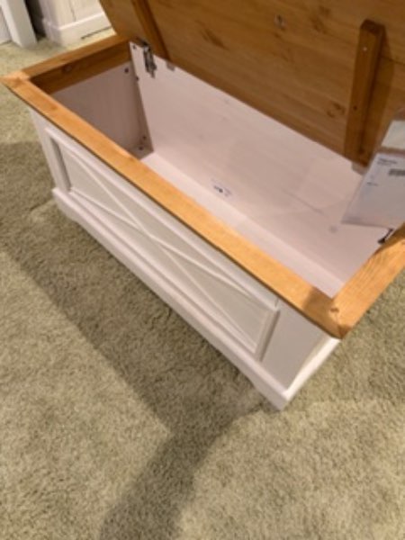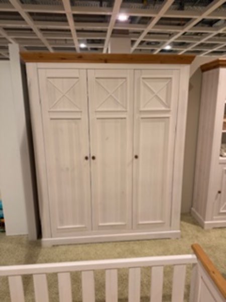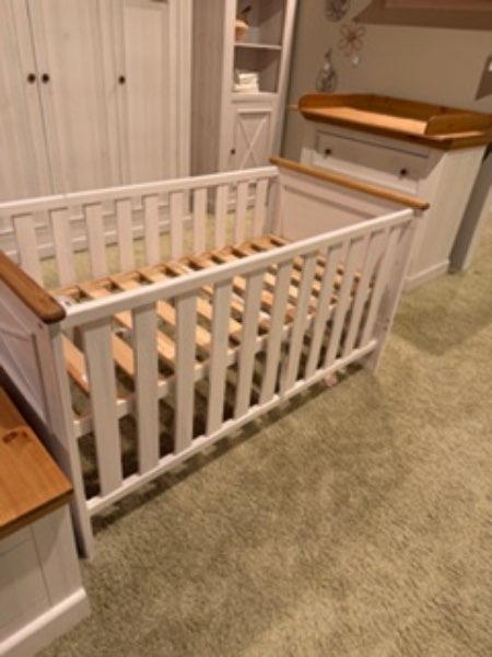 besteht aus: Kinderbett,Wickelkommode,Standregal, Kleiderschrank, Truhe und zwei Wandregalen