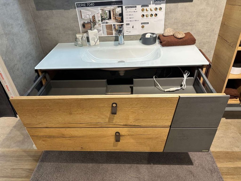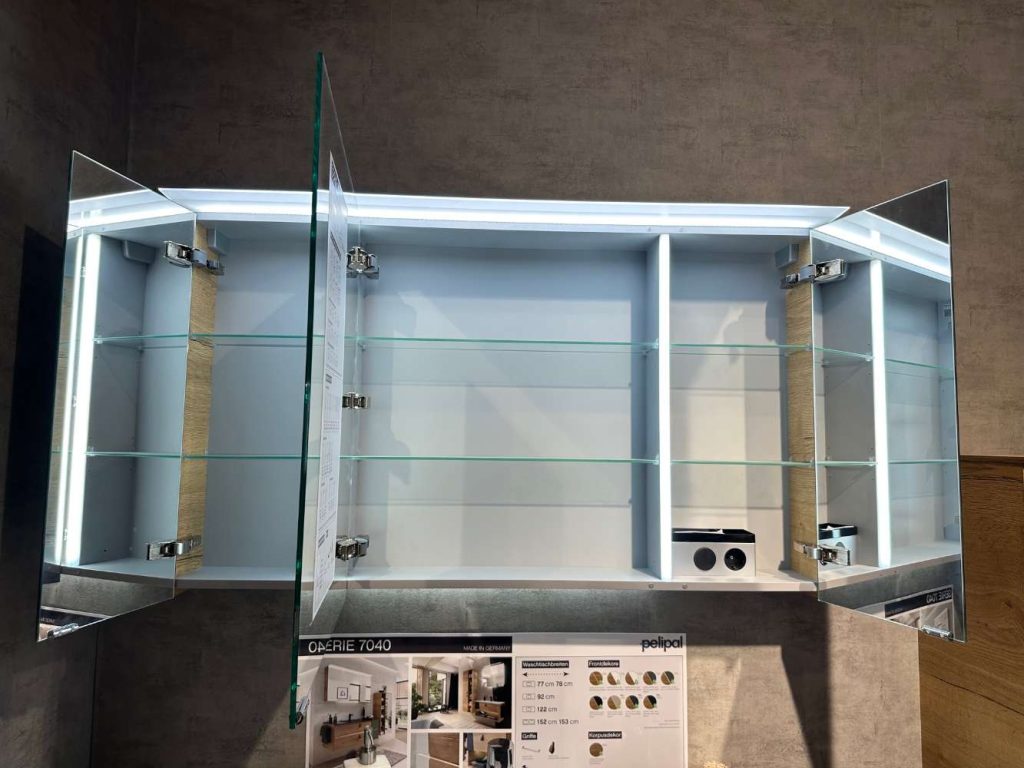 Bemerkung Das Badmöbel-Set Modell 7045 von PELIPAL kombiniert stilvolles Design mit funktionaler Eleganz und bietet eine ideale Lösung für moderne Badezimmer. In einer ansprechenden Kombination aus Halifax Eiche und Oxid dunkelgrau wirkt es gleichzeitig natürlich und urban. Der Glaswaschtisch in optiwhite mit einer großzügigen Breite von 121 cm bietet ausreichend Platz und verleiht dem Raum durch seine Klarheit eine besondere Leichtigkeit. Der dazugehörige Waschtisch-Unterschrank mit zwei Auszügen bietet praktischen Stauraum für all Ihre Badutensilien und setzt mit seinen subtilen Lederschlaufen als Griffdesign stilvolle Akzente. Über dem Waschtisch zieht der dreitürige Spiegelschrank mit seiner Tiefe von 16 cm die Blicke auf sich und bietet nicht nur viel Platz hinter seinen Türen, sondern auch eine perfekte Beleuchtung durch die integrierte LED-Lichtleiste. Dank des LEDplus Sensorschalters lässt sich die Beleuchtung besonders komfortabel steuern, was ein Highlight in der täglichen Nutzung darstellt. Die beiden Handtuchhalter in Chrom-Glanz fügen sich nahtlos in das Gesamtbild ein und sorgen für zusätzlichen Komfort und Nutzen. Abgerundet wird dieses edle Set durch das Midischrankregal mit den Maßen von ca. 50x121x34 cm, das ideal für die Aufbewahrung zusätzlicher Badutensilien oder Dekorationen geeignet ist. Sowohl der Korpus als auch die Front in Halifax Eiche quer NB verleihen den Möbelstücken eine natürliche Optik, die sich harmonisch in unterschiedliche Badgestaltungen einfügt. Mit dem Badmöbel-Set von PELIPAL erleben Sie eine gelungene Verbindung von Ästhetik und Funktionalität, die Ihrem Badezimmer einen hochwertigen und modernen Charakter verleiht.