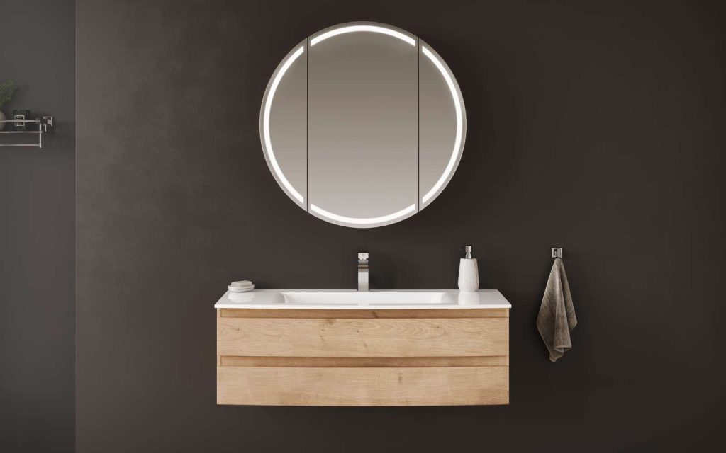BemerkungElegante Badkombination der Serie Vora mit Front und Korpus in Eiche Natur-Nachbildung, Grifflos, mit praktischer Push-to-Open Funktion, Waschtisch-Set bestehend aus: Waschtisch Evermite in weiß, 121,2 cm, inklusive CLOU Ab- und Überlaufsystem, Waschtischunterschrank, 1 Metallschubkasten mit Einzugsdämpfung und Siphonausschnitt inklusive OrgaBase, 1 Metallschubkasten mit Einzugsdämpfung, B/H/T ca. 121,2 x 41,4 x 48 cm. Ohne Hahnlochbohrung, Spiegelschrank auf Trägerplatte in Weiß, 2 Mittelwände, 2 Glasfachböden, umlaufend mit LED-Beleuchtung, 27 Watt, 912 Lumen, 2700-6500 K, 1 LED Converter 30 Watt, 2 Regale hinter den äußeren Türen, 3 feste Holzfachböden, 1 Schalter-Steckdosen Element, mittlerer Türanschlag links, Durchmesser ca. 90 cm. Tiefe ca. 15 cm.