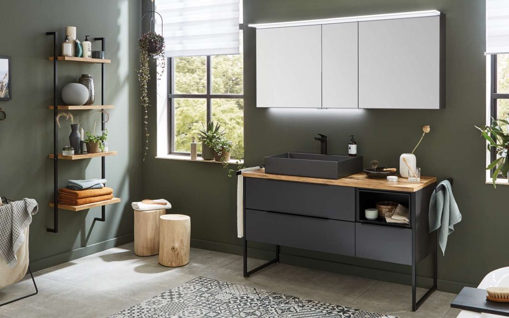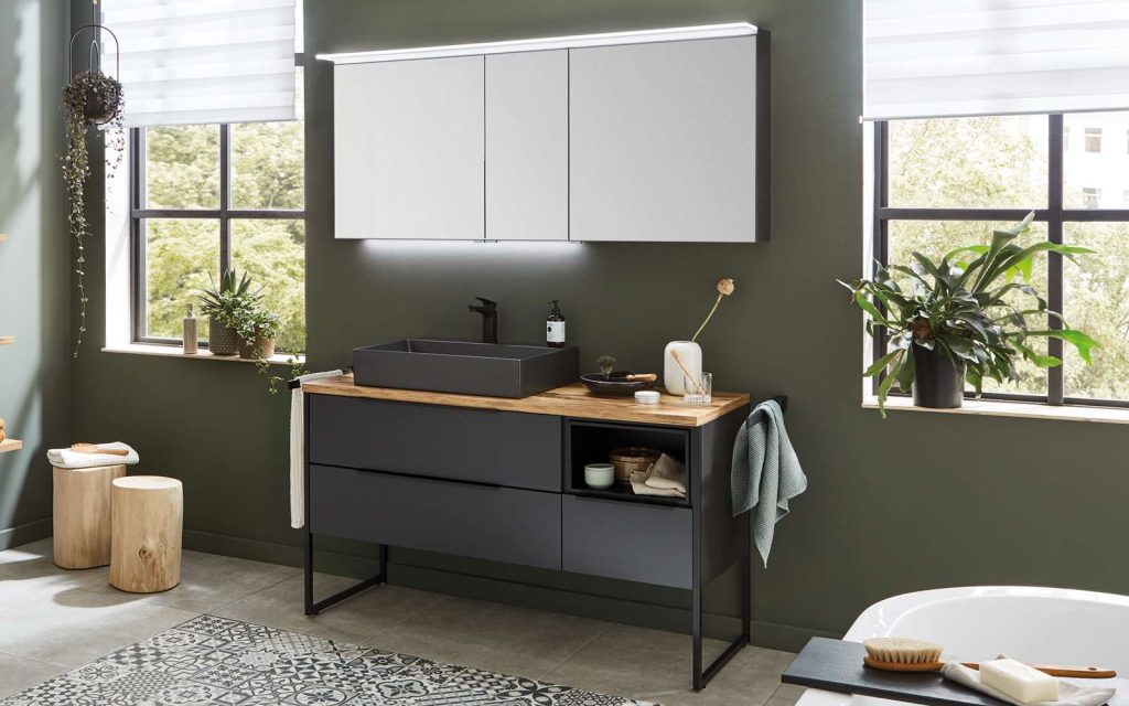 BemerkungFront und Korpus in Cosmos grey matt, Griffleiste in schwarz, Spiegelschrank, 2 x ca. 90 cm breite doppeltverspiegelte Türen, 1 x ca. 60 cm breite doppeltverspiegelte Tür, 6 Glaseinlegeböden, inklusive LED-Flächenleuchte, B/H/T ca. 150 x 66 x 15 cm, Keramik-Aufsatzwaschtisch in carbone matt, inklusive Hahnlochbohrung und Permanentablauf B/H/T ca. 50 x 13 x 45 cm, Waschtischunterschrank links, 2 Auszüge, oberer Auszug inklusive Siphonausschnitt, B/H/T ca. 90 x 48 x 47 cm, Plattenunterschrank, rechts, 1 Einschubregal oben, 1 Auszug unten, B/H/T ca. 60 x 48 x 47 cm, Waschtischplatte in Hunton Eiche Nachbildung, inklusive Ausschnitt links für den Waschtisch, B/H/T ca. 154,6 x 2,8 x 49,5 cm.