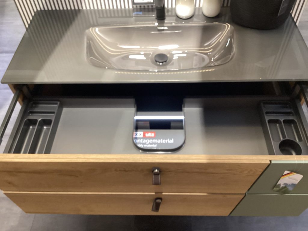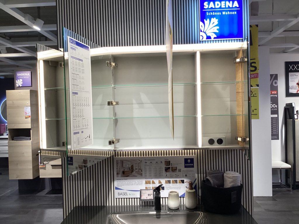 Bemerkung !Preis ohne Armatur! Das Modell Basel bietet ein exquisites Komplettbad-Design, das modernes Flair und Funktionalität vereint. Als Ausstellungsware ist dieses Set ein wahres Highlight für jedes Badezimmer. Der modellierte Glas-Waschtisch in Metallic wird durch eine raffinierte Waschplatzbeleuchtung unterhalb des Spiegelschranks stilvoll in Szene gesetzt. Diese Beleuchtung, die von einer praktischen Aufbauleuchte unterstützt wird, unterstreicht das elegante Design und sorgt für eine angenehme Atmosphäre. Besonders beeindruckend ist der Spiegelschrank mit doppelter Verspiegelung, der nicht nur mit einer integrierten Beleuchtung ausgestattet ist, sondern auch die Emotion-Beleuchtung bietet, die das Ambiente individuell anpasst. Die exklusiven Ledergriffe am Waschtisch verleihen dem Gesamtbild einen Hauch von Luxus. Abgerundet wird die Ausstattung durch eine Waschtischbeleuchtung mit Bewegungssensor, die sowohl praktisch als auch innovativ ist. Basel ist das ideale Komplettbad für alle, die Wert auf stilvolles Design und durchdachte Funktionalitäten legen. Für Rückfragen steht Ihnen Frau Leonie Wiese unter 030-25549 407568 gern zur Verfügung.