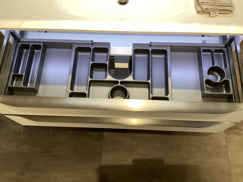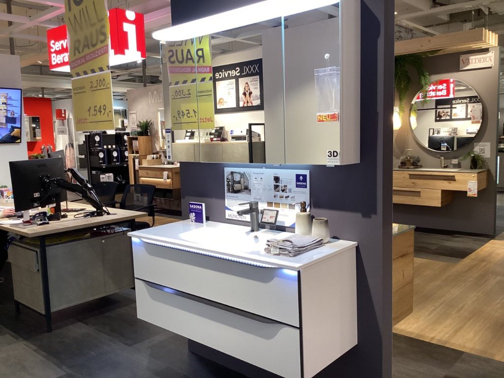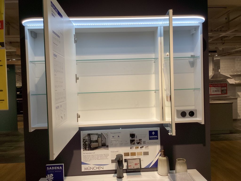 Das Komplettbad-Modell München bietet eine elegante und funktionale Lösung für Ihr Badezimmer. Dieses Ausstellungsstück beeindruckt mit einem durchdachten Design und hochwertigen Details, die jeden Besuch im Bad zu einem besonderen Erlebnis machen. Integrierte Aufbauleuchten sorgen für eine optimale Ausleuchtung Ihrer tägliche Routine, während die stimmungsvolle Waschplatzbeleuchtung ein angenehmes Ambiente schafft. Die stilvoll um den Korpus der Schubladen gezogene Metallgriffleiste verleiht dem Bad nicht nur einen modernen Touch, sondern bietet auch praktische Handhabung. Zusätzlich wird das Design durch die dezente, integrierte Beleuchtung in den Griffleisten am Waschtisch harmonisch abgerundet. Dieses Komplettbad strahlt eine zeitlose Ästhetik aus, die sich optimal in verschiedenste Einrichtungsstile einfügt und Ihren Raum mit einem Hauch von Luxus und Funktionalität bereichert.