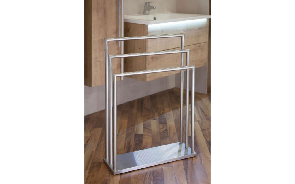 BemerkungDieser elegante Badhandtuchhalter aus gebürstetem Edelstahl kann in jedem Badezimmer hingestellt werden. Durch seine stabile Bodenplatte mit den 3 Stangen steht der Handtuchhalter stabil auf dem Boden. Setzen Sie Ihre Handtücher in Szene. B/H/T ca. 58 x 83 x 20 cm.