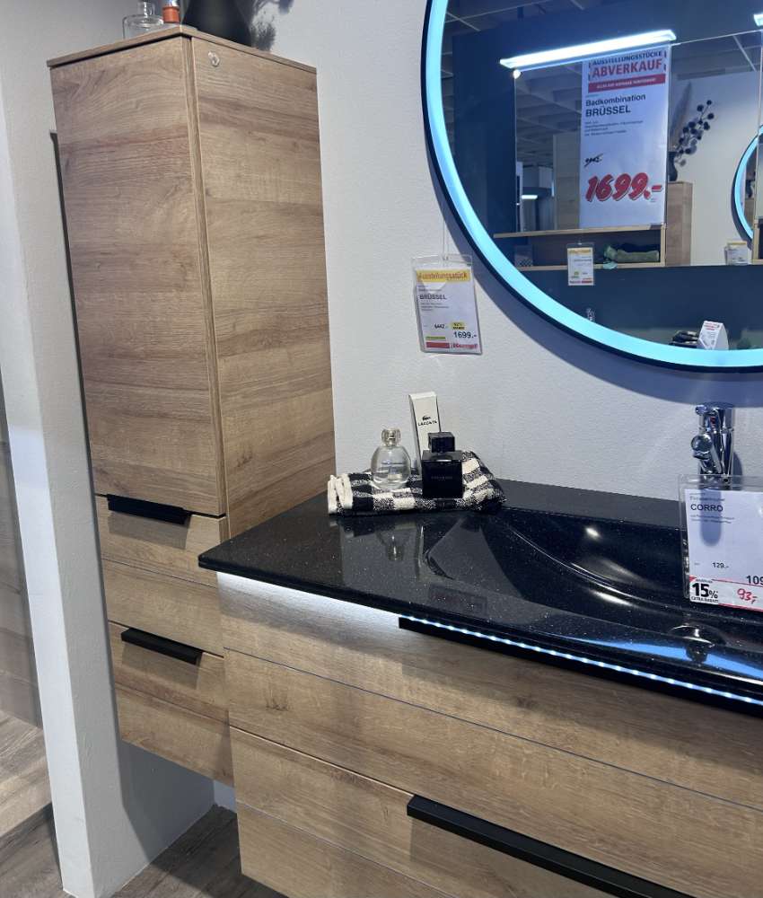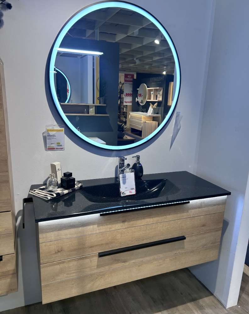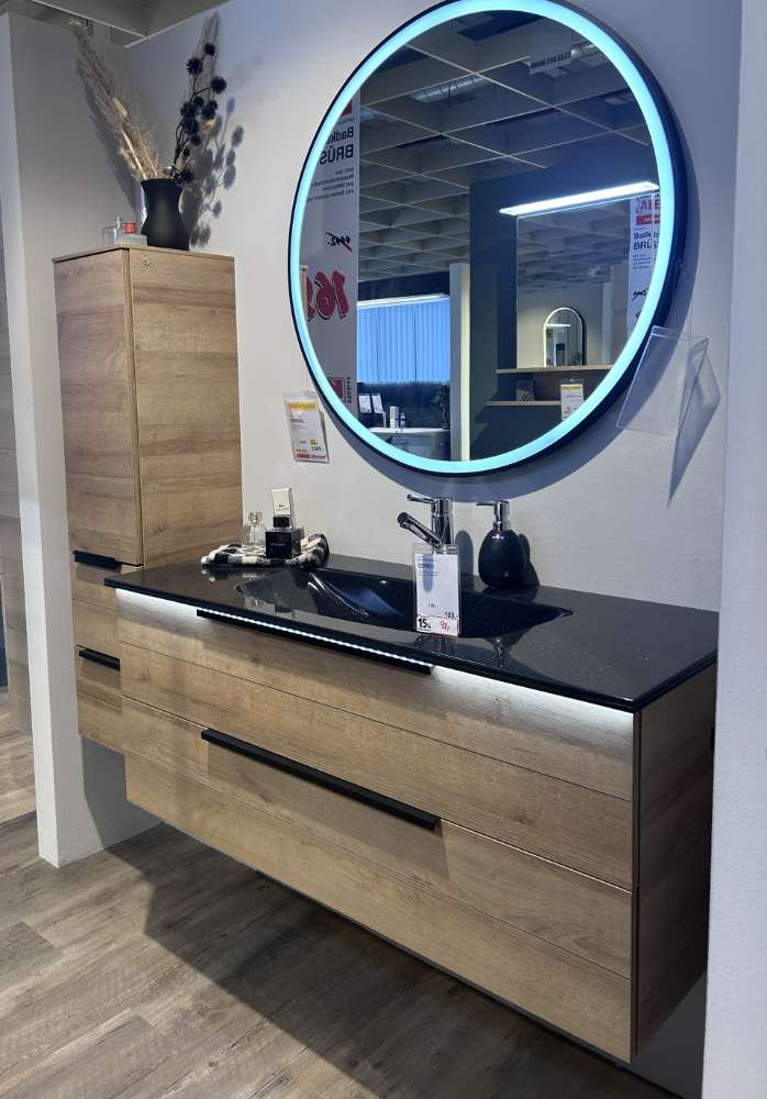 best. aus: - Waschtischkombination mit Mineralmarmor-Waschtisch und Unterschrank ca. 120 cm breit - Flächenspiegel rund, ca. 90 cm Durchmesser mit LED-Beleuchtung - Midischrank ca. 30x121x33 cm B/H/T ohne Armatur