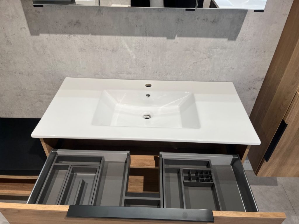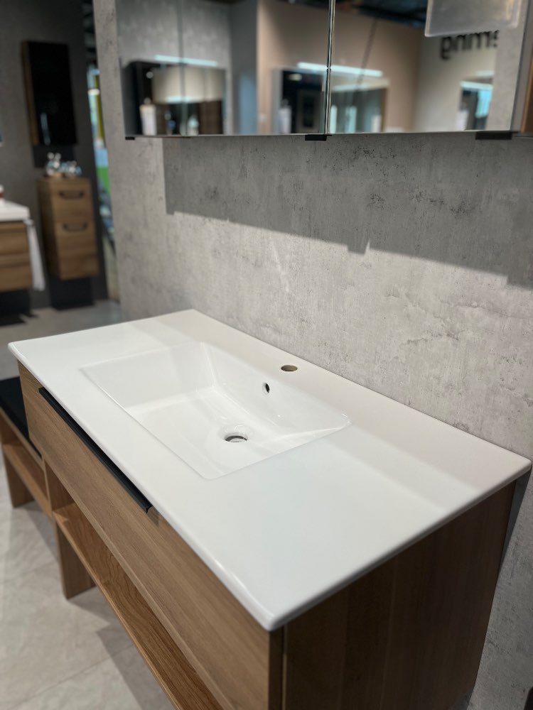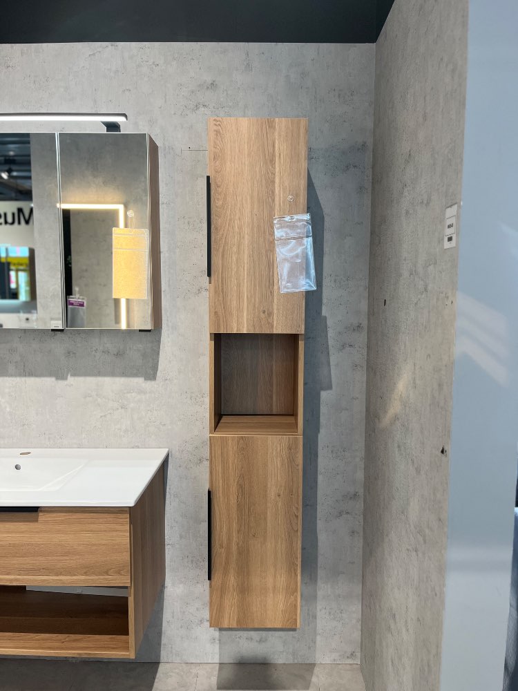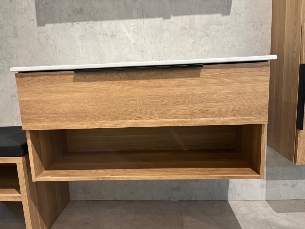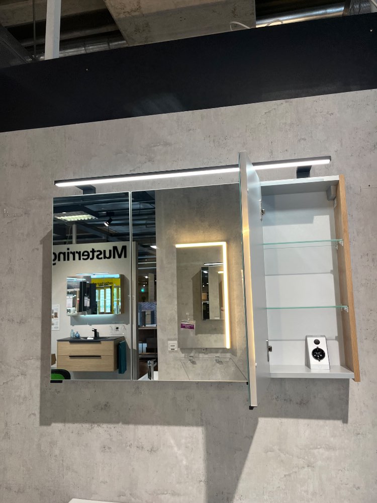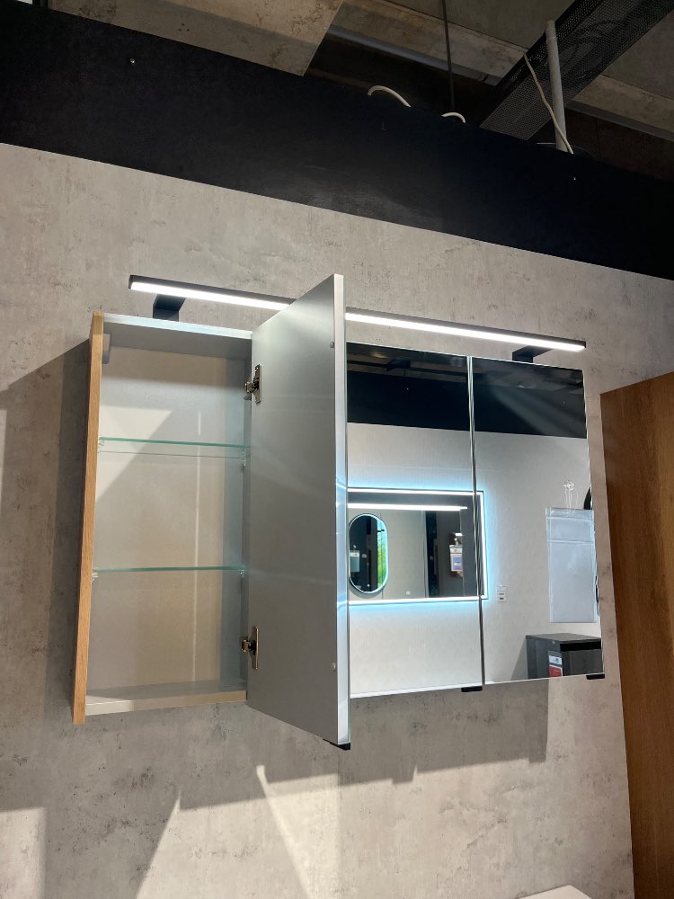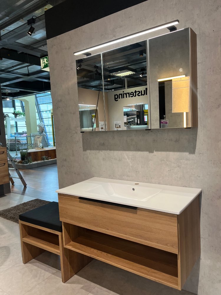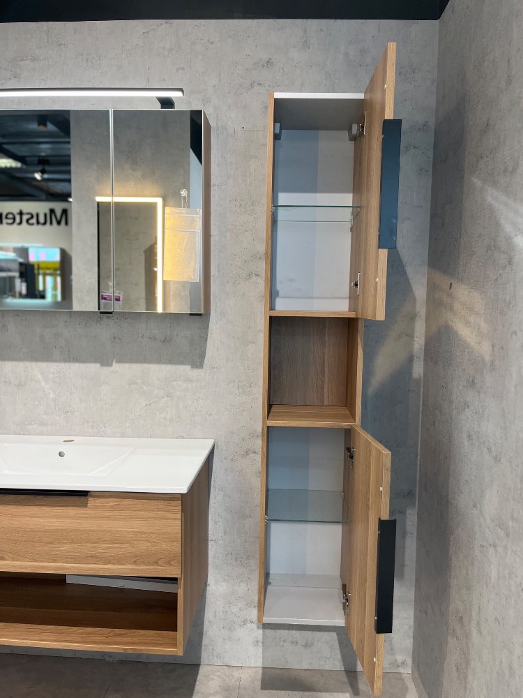BemerkungGeräumige Badkombination in Eiche braun Nachbildung bestehend aus: Keramik-Waschtisch weiß, Waschtisch-Unterschrank ca. 1030x500x510mm, Spiegelschrank-Set 3 Türen mit Beleuchtung schwarz ca. 1000x650x170mm, Hochschrank mit 2 Türen, 1 offenes Fach und 2x Glasboden ca. 300 x 1600 x 300 mm, Sitzbank mit Sitzkissen schwarz ca. 600 x 508 x 450 mm, INKL. Sensorschalter, Innenbeleuchtung, Organisationseinsatz