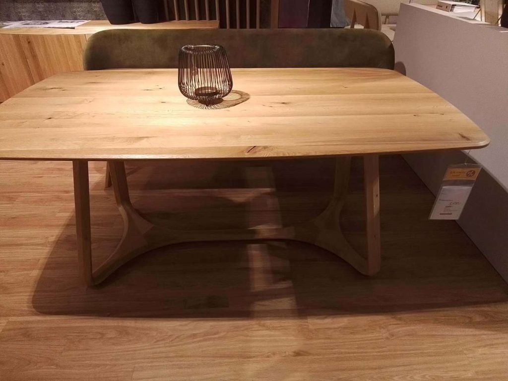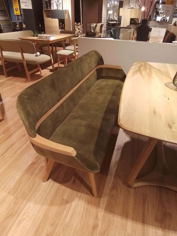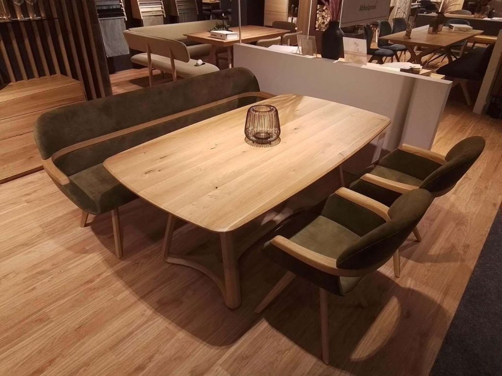 Bank ca. 210cm, Asteiche gebürstet massiv, Bezug:W031, Esstisch ca. 180x100cm, Asteiche gebürstet natur geölt, 2x Armlehnenstuhl