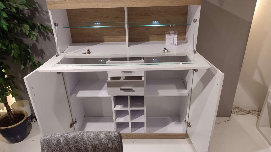 BemerkungDer Barschrank Laredo in Weiß mit Details in Nox Oak-Nachbildung verbindet modernes Design mit einem Hauch natürlicher Wärme. Hinter zwei Türen, einer Klappe, zwei Schubkästen und in acht offenen Fächern bietet er durchdachten Stauraum für Gläser, Flaschen und Accessoires – stilvoll sortiert und jederzeit griffbereit. Die Kombination aus klarer Linienführung und wohnlicher Holzoptik macht ihn zum dezenten Blickfang in jedem Raum. Ein Möbelstück, das Genuss und Ordnung charmant zusammenbringt.
