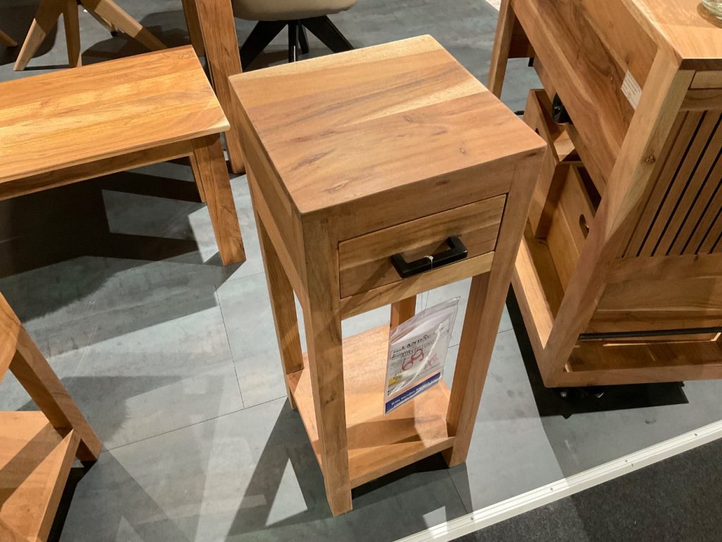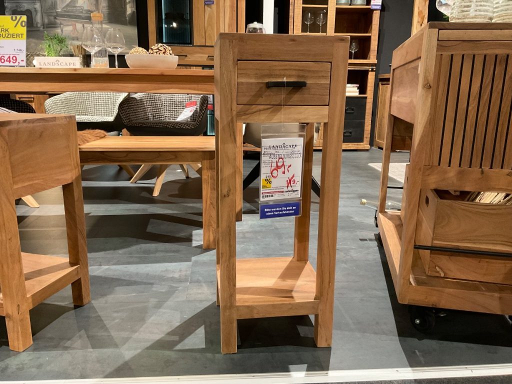 Bemerkung Der exquisite Telefontisch Akazio von GUTMANN verleiht Ihrem Zuhause einen Hauch von natürlicher Eleganz. Gefertigt aus massivem Akazienholz, besticht dieses Möbelstück durch seine zeitlose Schönheit und Robustheit. Mit den Maßen von ca. 30 / 80 / 30 cm passt der Tisch perfekt in jeden Raum und bietet ausreichend Platz, um Ihr Telefon sowie dekorative Elemente stilvoll in Szene zu setzen. Als Ausstellungsware präsentiert sich der Telefontisch in einem nahezu makellosen Zustand und bringt eine warme, einladende Atmosphäre in Ihr Interieur. Die einzigartige Maserung des Akazienholzes verleiht jedem Stück eine individuelle Note, die Ihr Zuhause bereichert. Der Akazio Telefontisch ist die ideale Wahl für alle, die Wert auf Qualität und Design legen. Bringen Sie ein Stück Natur in Ihr Zuhause und erleben Sie die harmonische Verbindung von Funktionalität und Ästhetik mit diesem wunderschönen Möbelstück. Zurbrüggen Listenpreis: 215 EUR Abverkaufspreis: 119 EUR bei eigener Abholung und Demontage 69 EUR