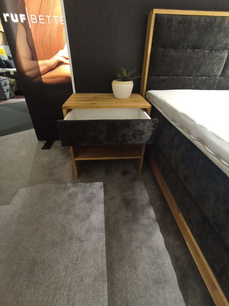 1x Bett mit Kopfteil 122 cm ( Stellmaß 191 x 119 x 216 cm) incl. Bettkasten, Sichtholzrahmen in Eiche massiv geölt