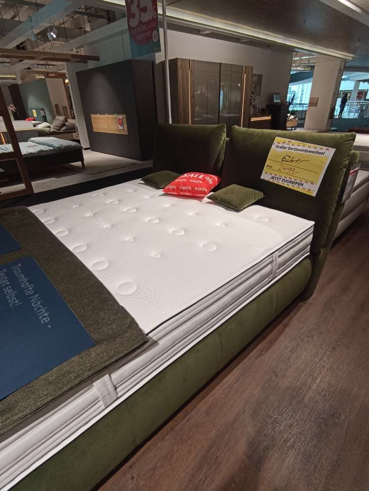 Bett Supreme Comfort bestehend aus: 1x Bett (Bettrahmen und Kopfteil, B/H/T: ca. 191/119/242 cm, Stoff grün) 1x Taschenfederkernmatratze (Partnermatratze H3+H4, ca. 180x200 cm) 1x Decke (ca 130x200 cm, Stoff dunkelgrün) 2x Kissen (ca. 50x50 cm, Stoff dunkelgrün) 2x Kissen (ca. 30x30 cm, Stoff grün)