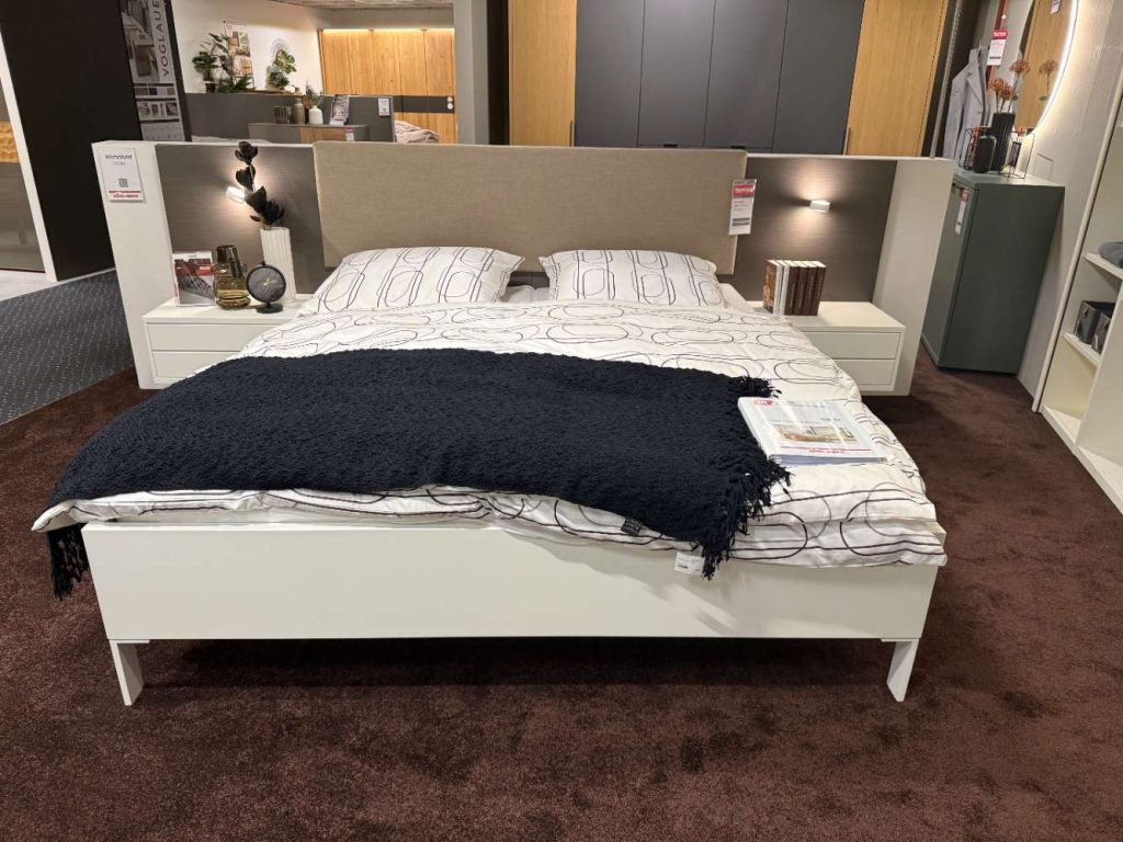 LF: 180x200cm, inkl. Nachtkonsolen und Paneel. Stellmaß: B/H/T: ca. 313x110x207cm. Ohne Matratzen, ohne Lattenrahmen und ohne Deko.