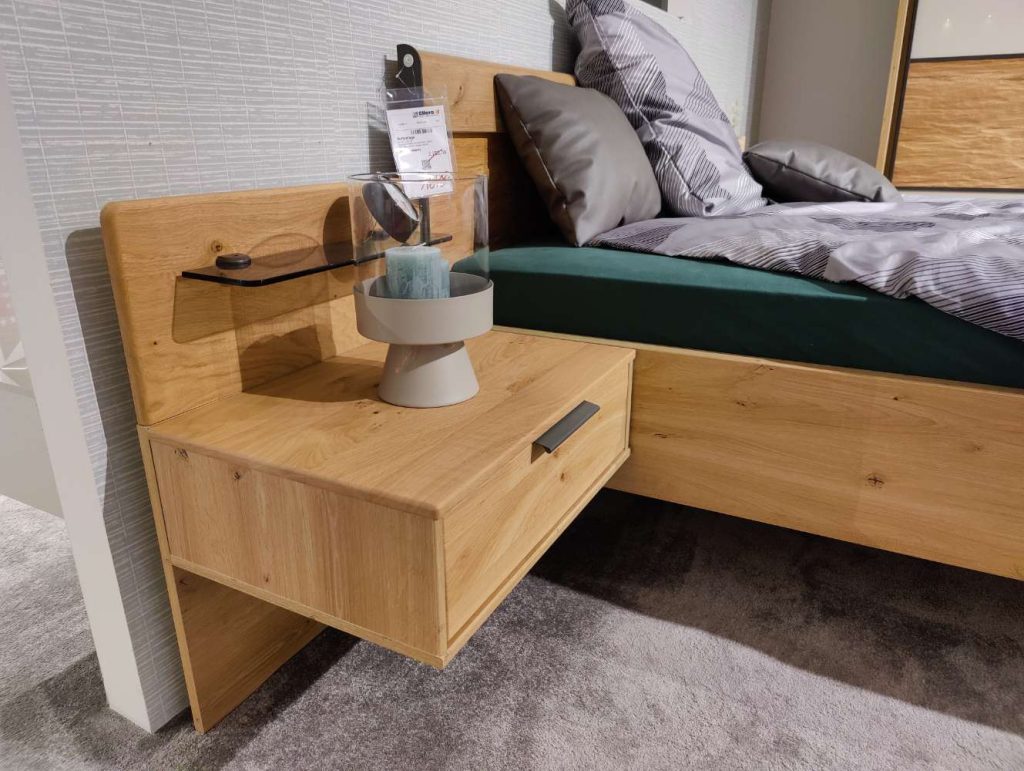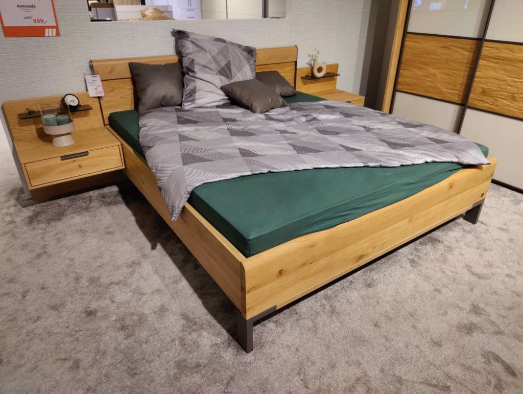 Bemerkung Entdecken Sie das elegante Doppelbett IL 1027 von INTERLIVING, das durch seine harmonische Kombination aus Eiche Bianco und Schieferakzenten besticht. Gefertigt aus hochwertigem Massivholz und robusten Holzwerkstoffen, strahlt es natürliche Wärme und Stabilität aus, die Ihr Schlafzimmer in eine Oase der Ruhe verwandeln. Mit einer großzügigen Liegefläche von 180 x 200 cm bietet das Bett ausreichend Platz für einen erholsamen Schlaf. Die Gesamtmaße von 249 x 208 x 97 cm machen es zu einem imposanten Blickfang, der dennoch durch seinen minimalistischen und zeitlosen Stil überzeugt. Besonders hervorzuheben ist das inkludierte Paar Nachttische, das für zusätzlichen Stauraum sorgt und das Gesamtbild harmonisch abrundet. Zudem bringt das Doppelbett eine integrierte Beleuchtung mit, die eine sanfte und stimmungsvolle Atmosphäre schafft. Beachten Sie bitte, dass das Bett ohne Lattenrost und Matratzen geliefert wird, sodass Sie diese nach Ihren individuellen Bedürfnissen ergänzen können. Als Ausstellungsstück zeugt es von bewährter Qualität und Handwerkskunst, die Ihnen viele Jahre Freude bereiten wird.
