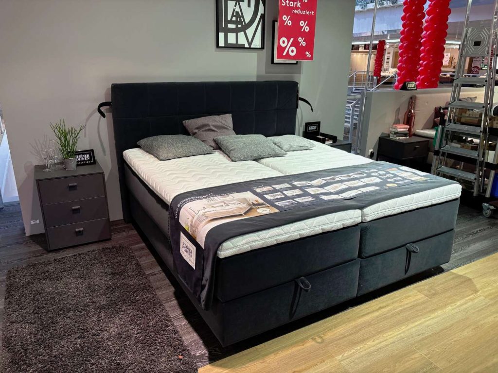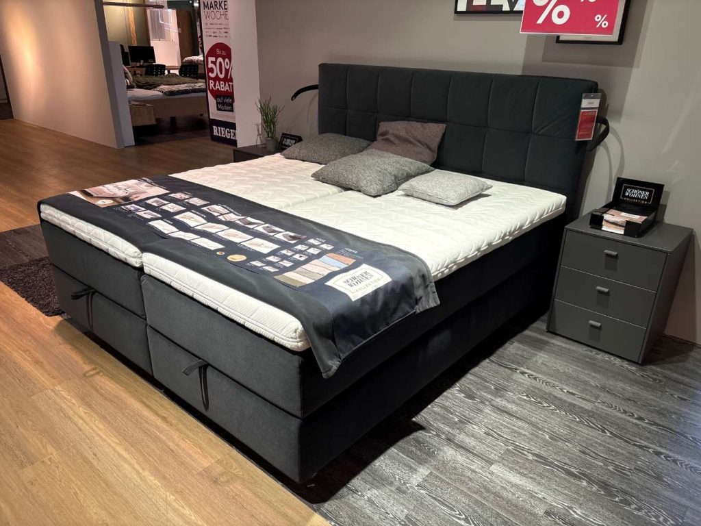 Für erholsamen Schlafkomfort sorgen zwei 1000 TFK Einzel-Matratzen mit unterschiedlichen Härtegraden (H2 und H3) und einer Höhe von 23 cm. Diese werden durch zwei SWKM Gel Topper ergänzt, die ein individuelles Liegegefühl bieten. Die Komfortausstattung wird komplettiert durch ein Kissen-Set bestehend aus verschiedenen Größen, das für zusätzliche Gemütlichkeit sorgt. Ein Wendeplaid in der Größe von 130 x 240 cm ergänzt die luxuriöse Schlaflandschaft und bietet vielfältige Gestaltungsmöglichkeiten.
