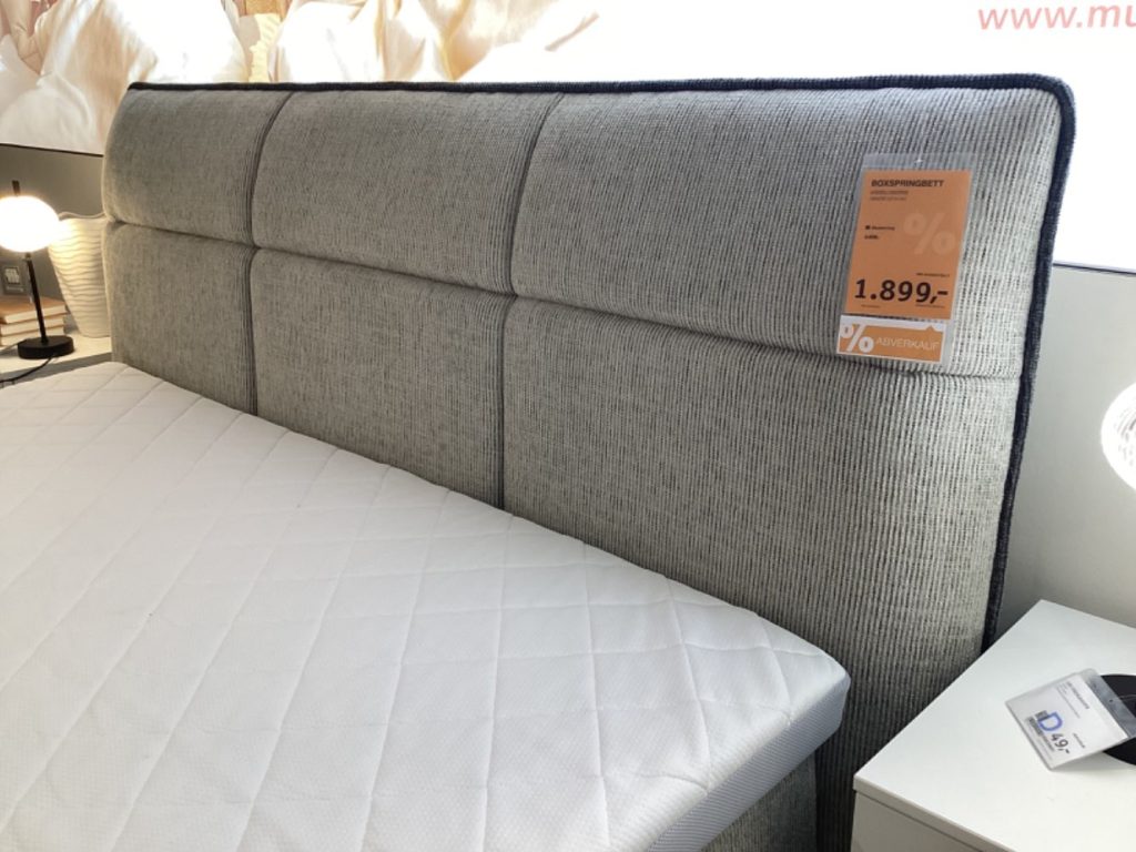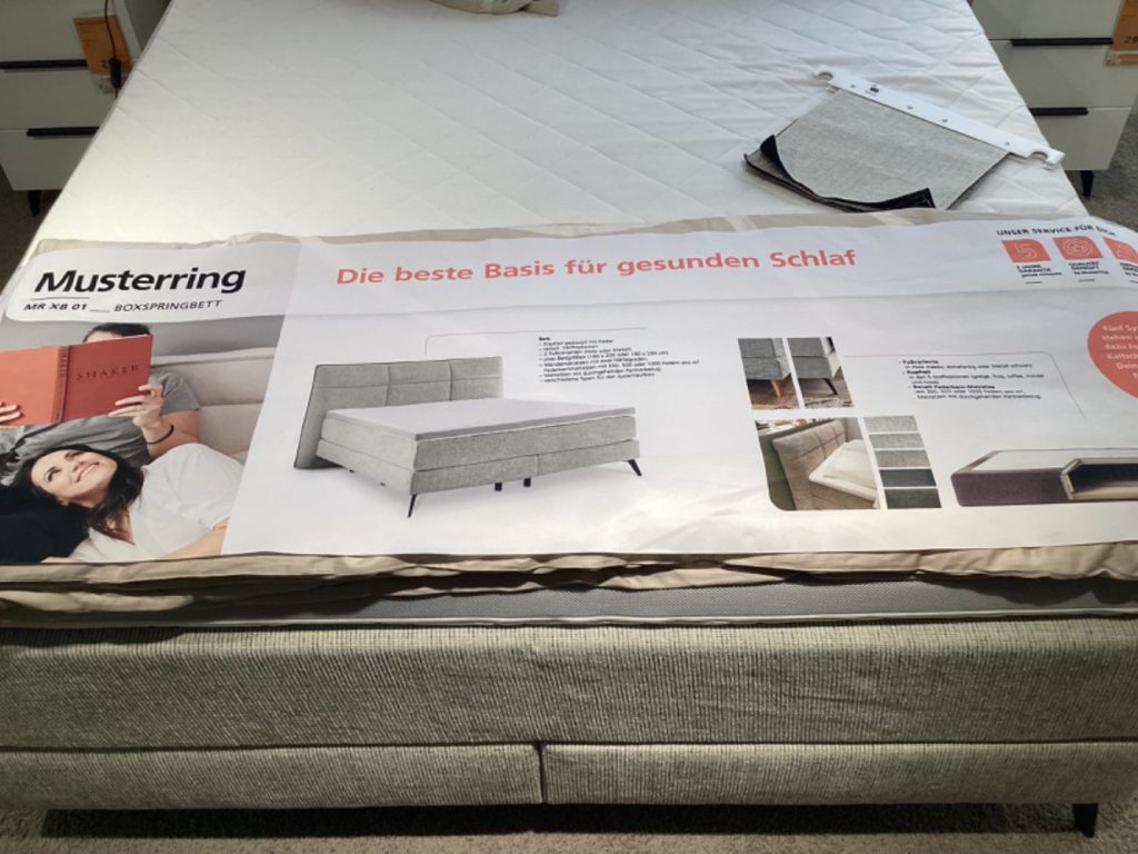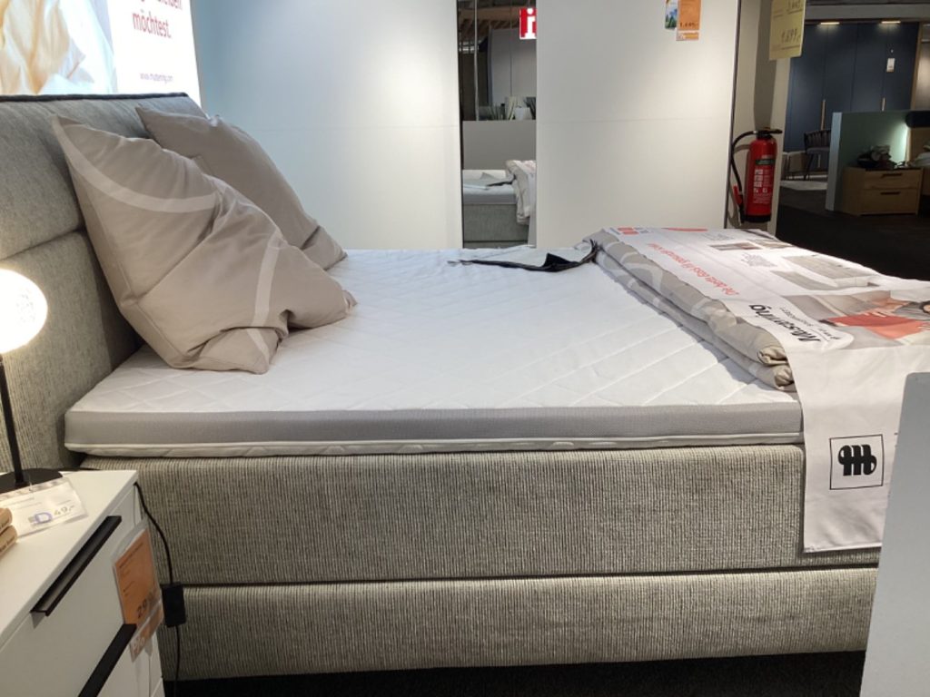 Dieses Ausstellungsstück überzeugt zusätzlich mit seiner durchdachten Ausstattung: Der Bonellfederkern der Matratze ist mit 350 Federn pro Quadratmeter ausgestattet, wobei die linke Seite in Härtegrad H2 und die rechte in H3 gehalten ist, um individuellen Komfort zu gewährleisten. Ein zusätzlicher Kaltschaumtopper vom Typ 3092-70-50 sorgt für eine perfekte Anpassung an den Körper. Die Liegehöhe von 70 cm ermöglicht ein bequemes Ein- und Aussteigen, während die 15 cm hohen schwarzen Füße für solide Stabilität sorgen. Dieses Boxspringbett verbindet Ästhetik mit Funktionalität und garantiert ein Schlafvergnügen der Extraklasse.