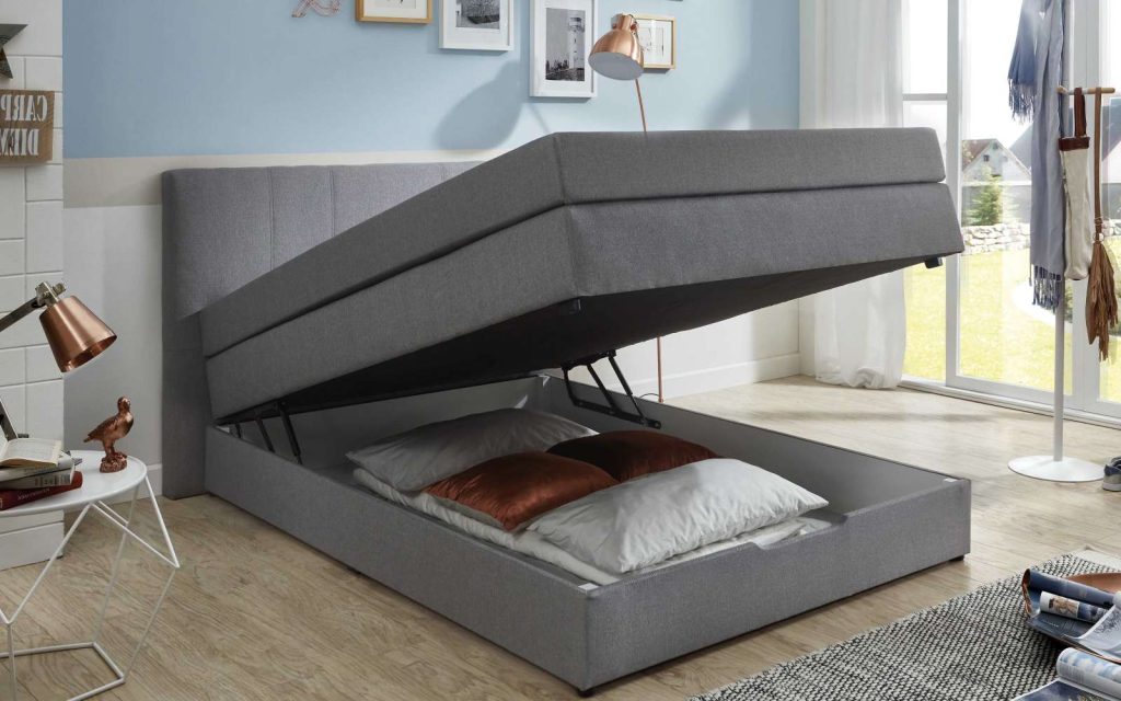 BemerkungBoxspringbett in Stoffbezug silver, Bonellfederkernmatratze in mittelfest, Unterbau mit Bonellfederung, Unterbau und Bettkasten nicht zerlegbar, Kopfteil Ziernähten, inklusive Komfortschaum-Topper H ca. 6 cm, Liegefläche ca. 140 x 200 cm.