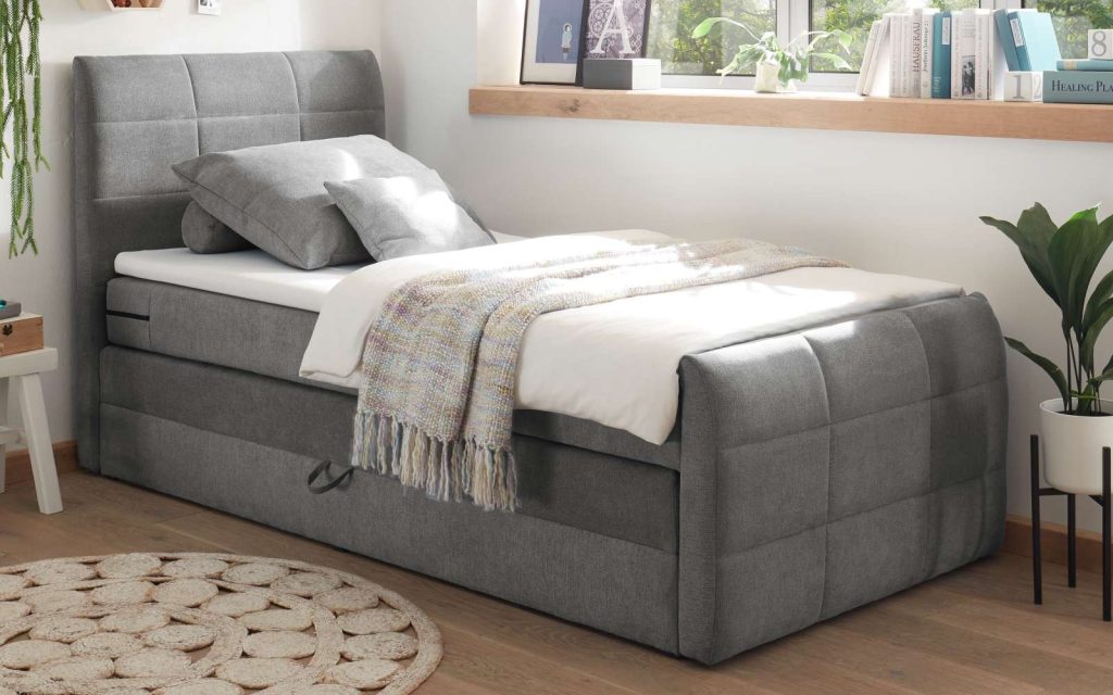 BemerkungBoxspringbett mit Stoffbezug in dark grey, Matratze 4-Gang-Bonellfederkern, hochwertiger Unterbau mit Bonellfederkern ist nicht zerlegbar, mit Bettkasten, inklusive Komfortschaum-Topper, 4 cm hoch, Bezug waschbar bis 40 Grad, Liegefläche ca. 100 x 200 cm.