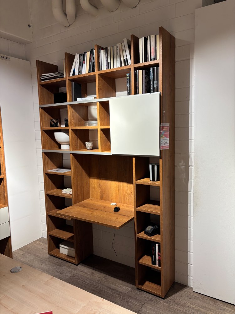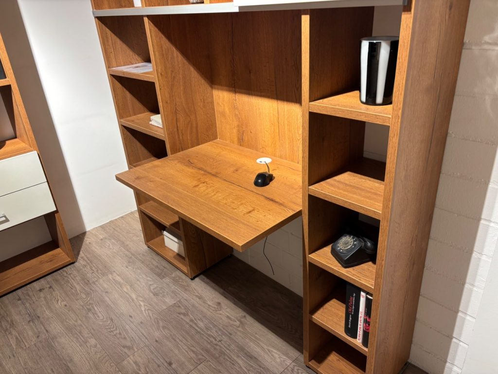 komplette Bürowand mit Schreibtischplatte und Schiebetüre Korpus und Böden: Cognac Dekor, Absetzung weiß
