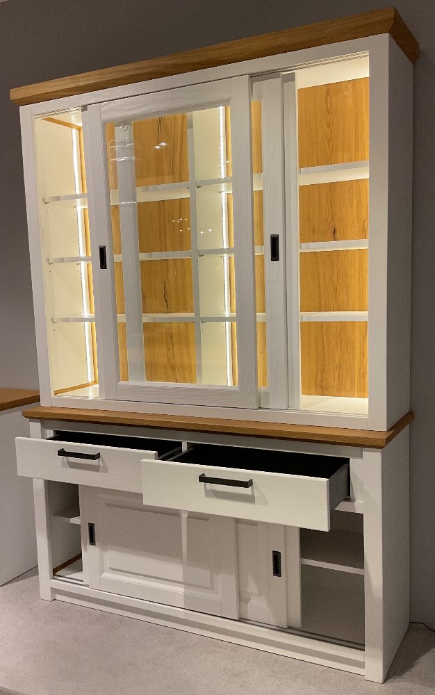 Astfichte weiss, Deckplatte Wildeiche furniert, 2 Glas-Vitrinen-Schiebetüren oben, 2 Holz-Schiebetüren unten, 2 Schubkasten, incl. LED-Beleuchtung, ca. 148 x 206 x 43 cm