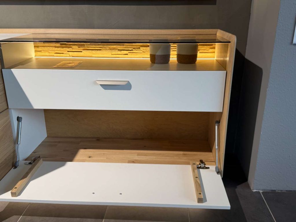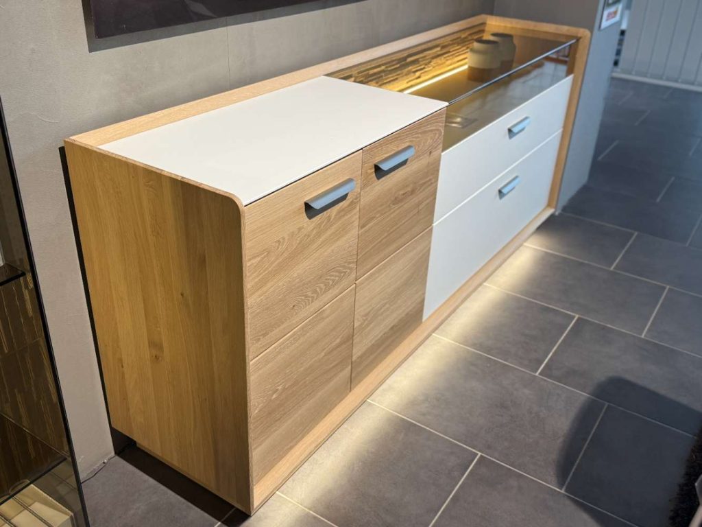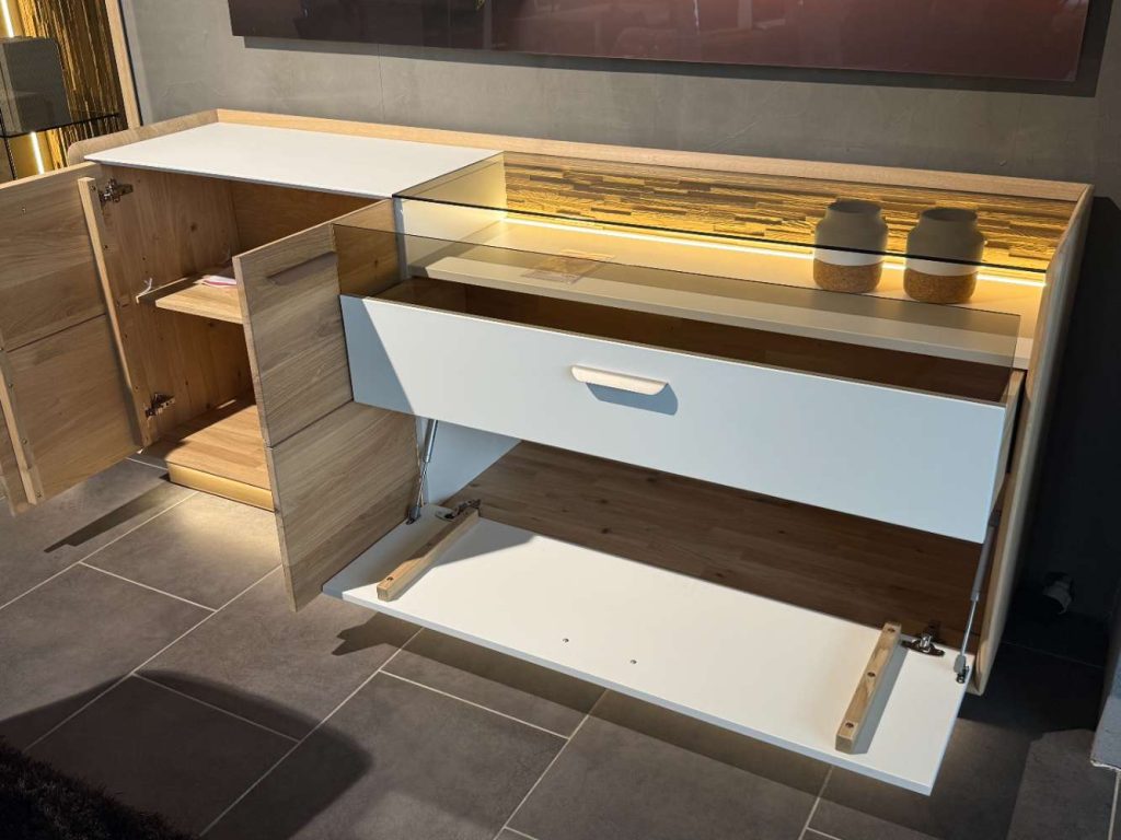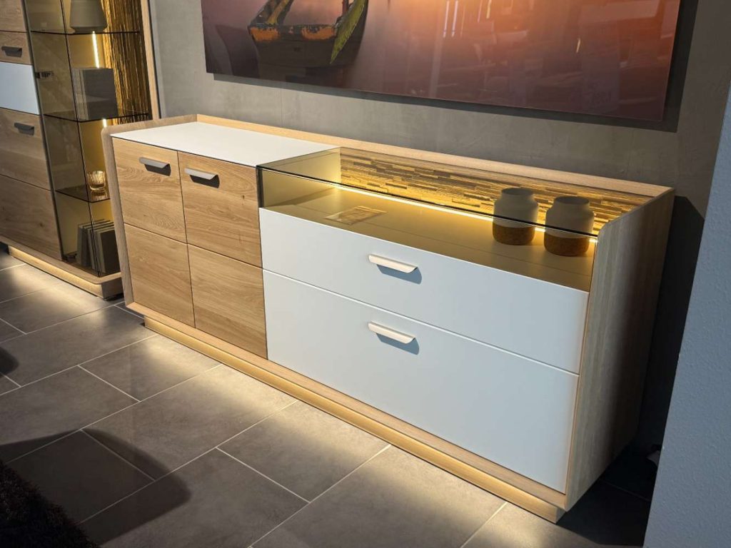 Ein besonderes Highlight dieser Kommode ist die integrierte LED-Glas- und Sockelbeleuchtung, die nicht nur für eine stimmungsvolle Atmosphäre sorgt, sondern auch Ihre Lieblingsstücke elegant in Szene setzt. Egal, ob Sie sie im Wohnzimmer, Schlafzimmer oder Flur platzieren – die Chandler-Kommode fügt sich nahtlos in jede Umgebung ein und verleiht Ihrem Raum eine edle Note. Als Ausstellungsstück von CASADA verkörpert sie Qualität und Designbewusstsein in perfekter Harmonie.