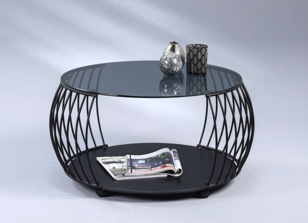 Couchtisch mit Glasplatte grau, Gestell Metall schwarz, auf Rollen Ø ca. 80 cm, H. ca. 46 cm.