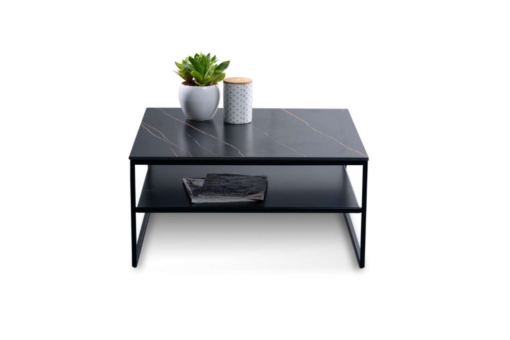 Couchtisch Platte gesinteter Stein dunkel, Ablage und Gestell Metall schwarz, B/H/T ca. 75x40x75 cm.
