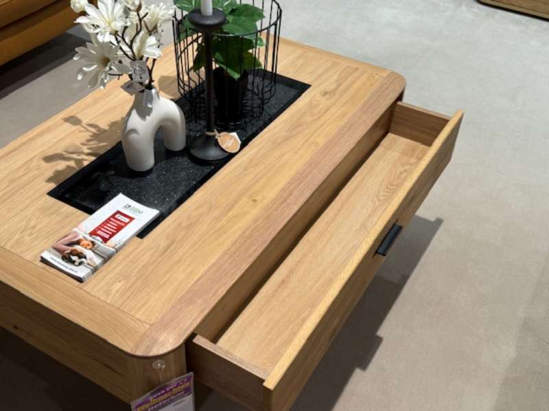 Bemerkung Dieser exquisite Couchtisch aus massiver Wildeiche verleiht jedem Wohnzimmer eine natürliche Eleganz. Durch die Kombination von Wildeiche und einer imposanten Graniteinlage wird das Möbelstück zu einem echten Blickfang, der sowohl rustikalen als auch modernen Einrichtungsstilen perfekt ergänzt. Als Ausstellungsware präsentiert sich der Tisch mit einem zeitlosen Charme, der durch seine hochwertige Verarbeitung unterstrichen wird. Mit den Maßen von ca. 110x46x65 cm bietet der Tisch eine großzügige Oberfläche, die das Platzieren von Dekorationen oder das Abstellen von Getränken und Snacks komfortabel ermöglicht. Ein integrierter Schubkasten sorgt zudem für praktischen Stauraum, in dem Fernbedienungen, Zeitschriften oder andere Utensilien diskret verstaut werden können. Dieser Couchtisch verbindet Funktionalität mit einem stilvollen Design und ist dabei sowohl robust als auch pflegeleicht, was ihn zu einer erstklassigen Wahl für ein stilvolles Zuhause macht.