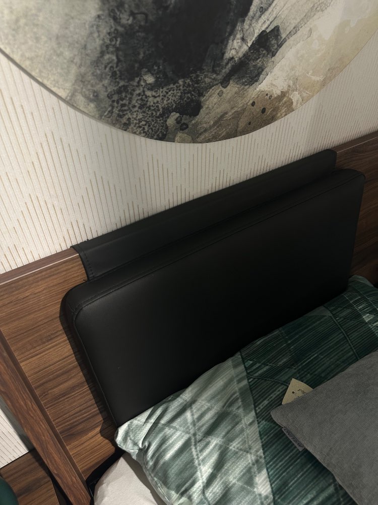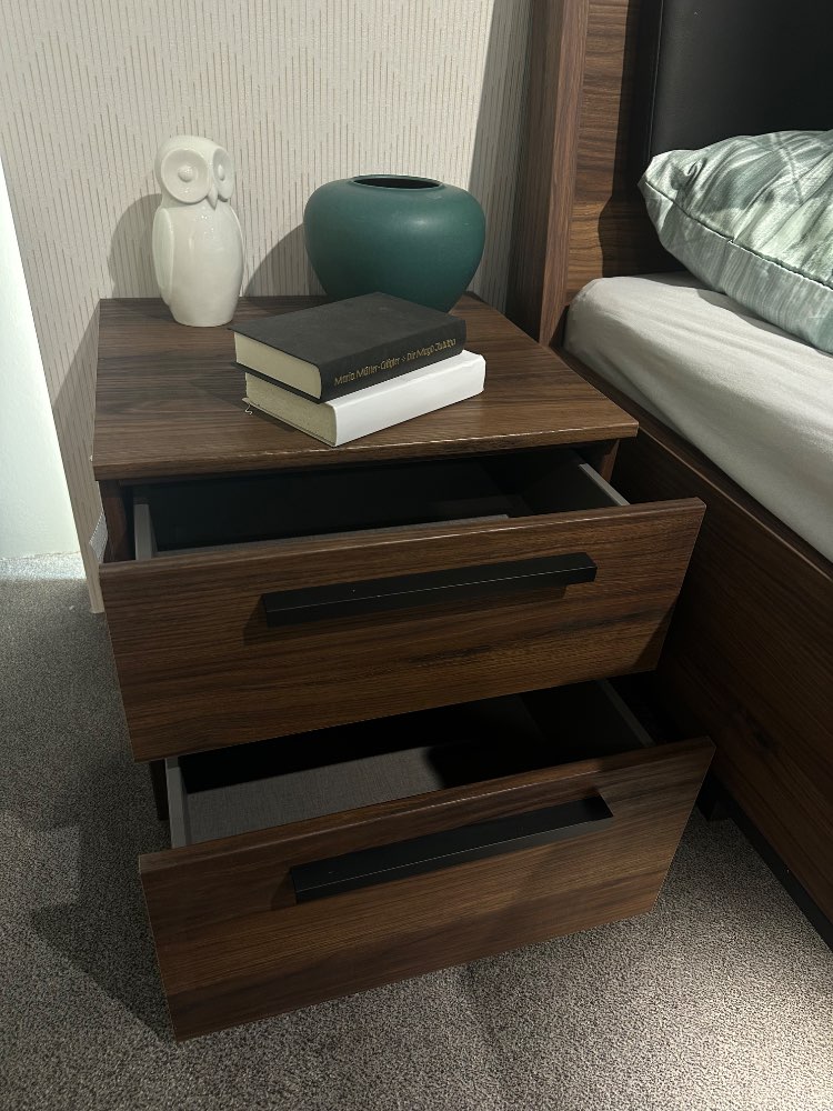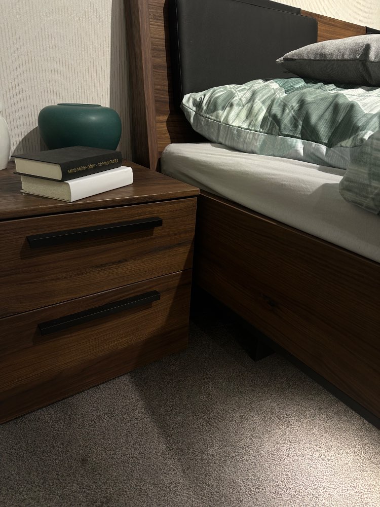 BemerkungDoppelbett in Catania Eiche Nachbildung, Stellmaß ca. 206x188cm, Liegefläche ca. 180x200cm, Kopfteilhöhe 100cm, Nackenpolster Rückenlehne in Leder Basalt, Inkl. LED Sensorbeleuchtung, mit 2x Nachtschrank ca. BHT 50x47x46cm, Schubkästen mit Vollauszug gedämpft, Ohne Dekoration, Lattenrahmen, Matratze und Bettwäsche!