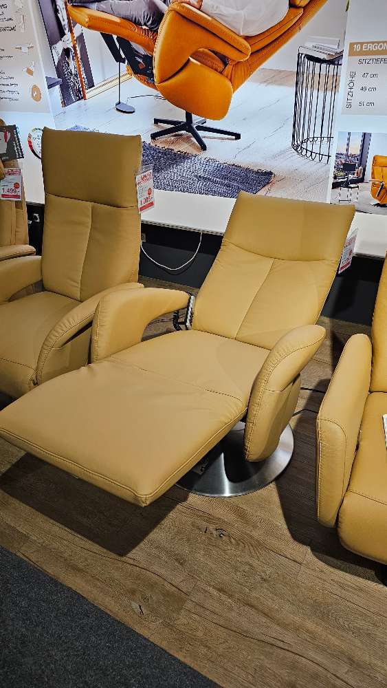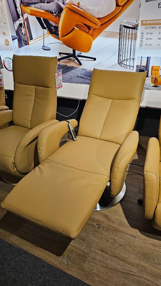 BemerkungDer Ergo Concept Style Relaxsessel von STEINPOL POLSTERIA bietet erstklassigen Komfort und modernste Technologie für Ihr Zuhause. Mit seinem hochwertigen Lederbezug in der Farbe "Punch Fb. honey" fügt er sich stilvoll in jede Wohnumgebung ein. Dieser Sessel ist speziell als Ausstellungsstück konzipiert und bringt die neuesten ergonomischen Standards der Stufe L3 in Ihre Räumlichkeiten. Er kommt ohne Kontrastnaht aus, was ihm ein elegantes und einheitliches Erscheinungsbild verleiht.