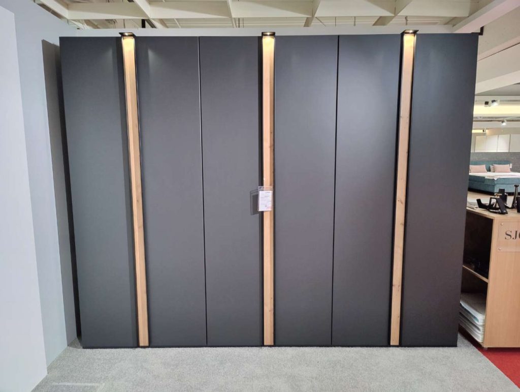 Besonders hervorzuheben ist die integrierte Beleuchtung, die sowohl die Benutzerfreundlichkeit erhöht als auch für eine angenehme Atmosphäre sorgt. Die Innenausstattung unterstreicht die durchdachte Gestaltung und sorgt für eine optimale Organisation. Als Ausstellungsware demonstriert der Schrank seine Qualität und Langlebigkeit. Der Lagos Drehtürenschrank ist der Inbegriff von modernem Design und praktischer Aufbewahrung und setzt in jedem Raum stilvolle Akzente.