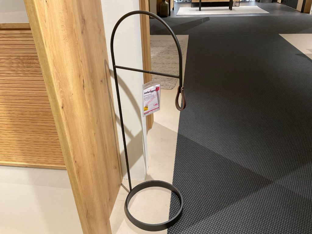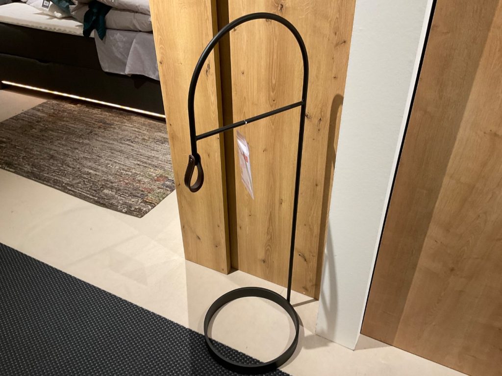 BemerkungEntdecken Sie die stilvolle Eleganz des LOOP Kleiderständers, ein Ausstellungsstück, das Funktionalität und modernes Design nahtlos vereint. Gefertigt mit einem langlebigen Drahtkufengestell aus Vollmetall, bietet dieser Kleiderständer eine robuste und zuverlässige Lösung für Ihr Zuhause. Die integrierte Strebe ermöglicht die ordentliche Aufbewahrung Ihrer Hosen, während die edle Lederschlaufe mit Ziernähten das elegante Einhängen von Krawatten erlaubt, wodurch Ihre Garderobe stets organisiert und griffbereit ist. Dieser Kleiderständer misst ca. 44 x 118 x 37 cm und passt perfekt in jeden Raum, ohne zu viel Platz zu beanspruchen. Die bodenschonenden Gumminoppen garantieren einen sicheren Stand und schützen Ihren Boden vor Kratzern. Ein Must-Have für alle, die Wert auf Design und Effizienz legen, bietet der LOOP Kleiderständer Ihnen nicht nur Funktionalität, sondern auch eine ansprechende Optik für Ihr Wohnambiente.