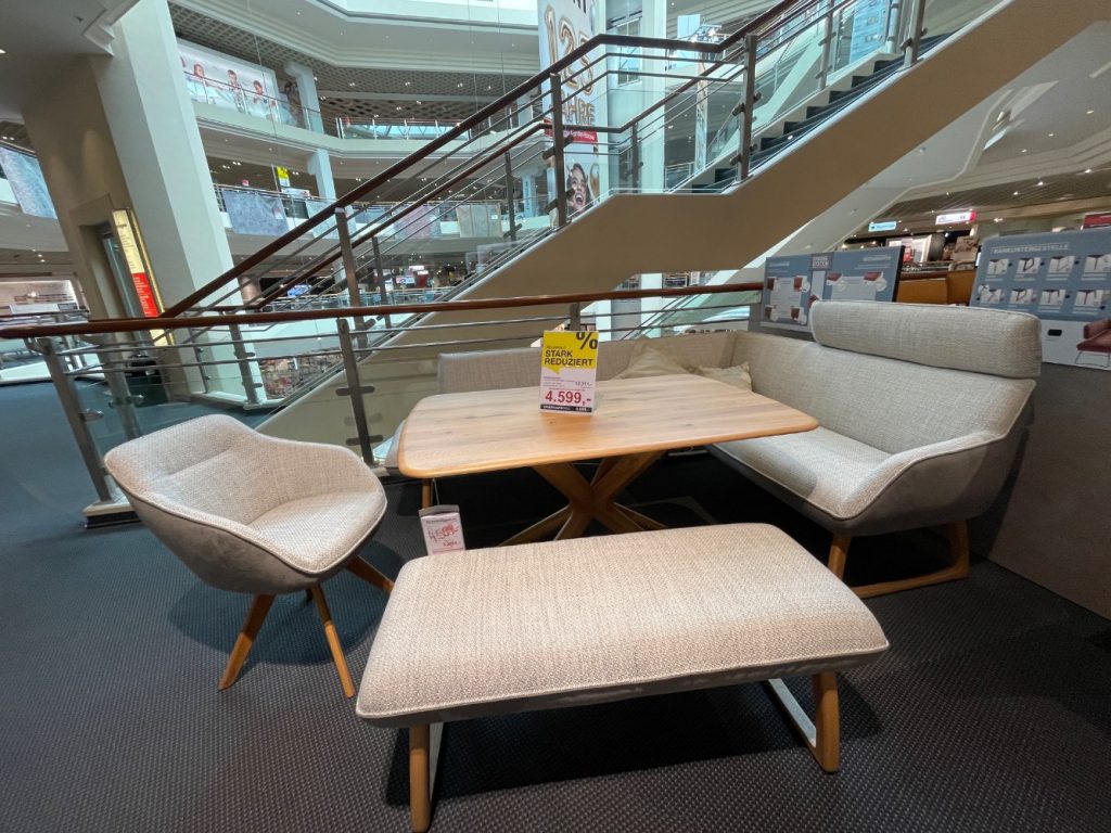 BemerkungDas Modell Manilo ist ein stilvolles Ensemble aus dem Hause KOINOR, das mit seiner zeitlosen Eleganz und Funktionalität beeindruckt. Die Kombination aus hochwertigem Webstoff in einem sanften Hellgrau und den natürlichen Wildeiche-Elementen verleiht diesem Möbelstück ein ansprechendes und modernes Aussehen. Die Eckbank, der Esstisch, eine Hockerbank, ein bequemer Sessel und zwei dekorative Kissen bieten Platz und Komfort für gesellige Runden sowie entspannte Stunden zu Hause.
