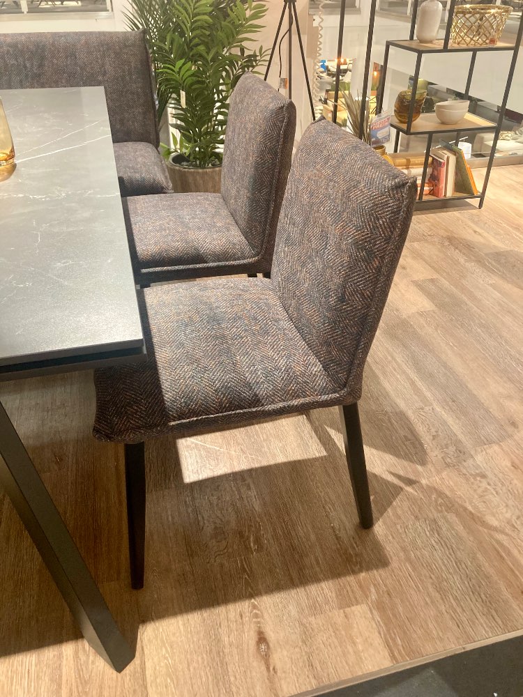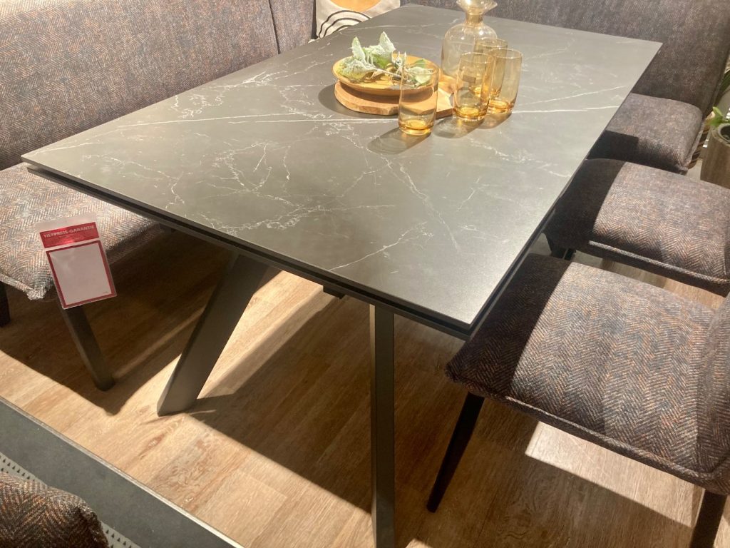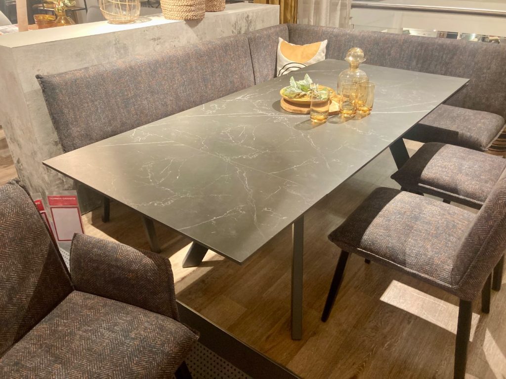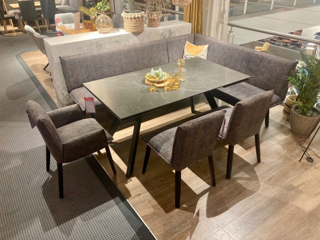 Bemerkung komplette Eckbankgruppe in Stoff bestehend aus 2 Stühlen und ein Armlehnstuhl in Stoff Eckbank (ca.: 224 x 186 cm) in Stoff Ausziehtisch in Keramik anthrazit inklusive beidseitigen Vorkopfauszug B/H/T: ca.: 160 (240) x 76 x 90 cm