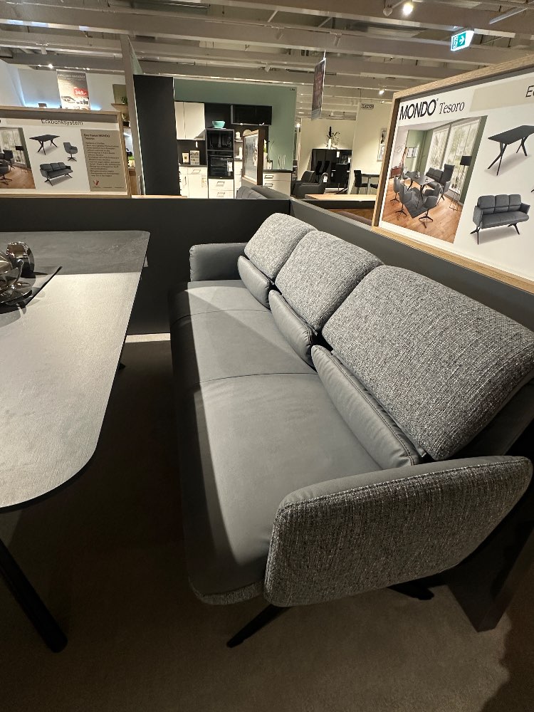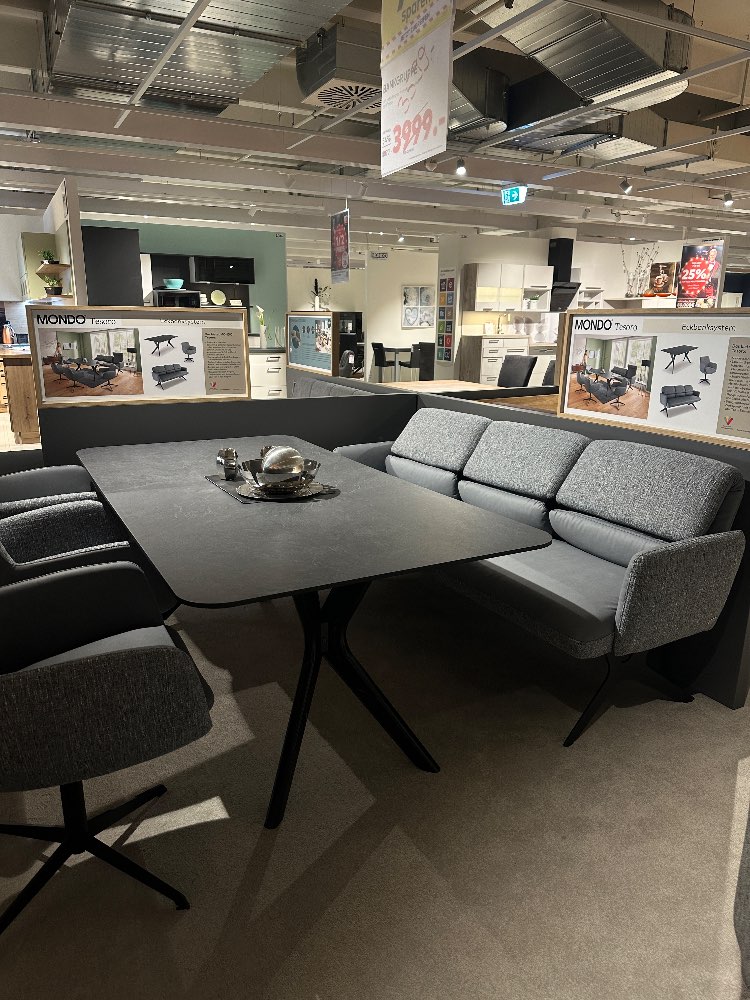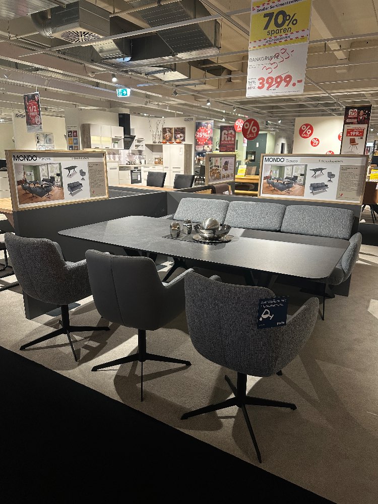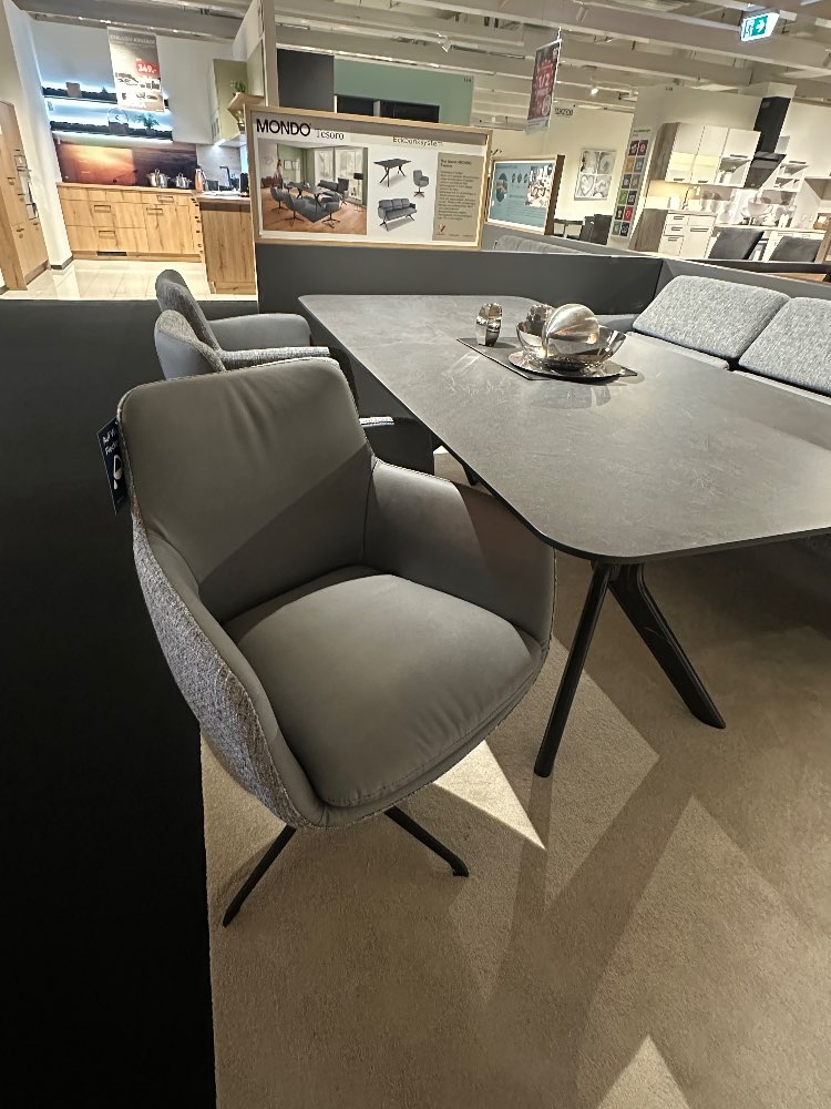 Bemerkung Eckbankgruppe bestehend aus: Esstisch: X-Gestell Buche schwarz Struktur; ca: 200x100 cm Bank: X-Kufe Metall schwarz Struktur; Korpus/Rücken&Sitz: niagara blue/ ocean; B/H/T ca. 202x89x76 cm Stuhl mit Armlehnen x3: Drehkreuz Metall schwarz Struktur; Bezug außen niagara blue/ innen ocean; B/H/T ca. 59x84x65 cm