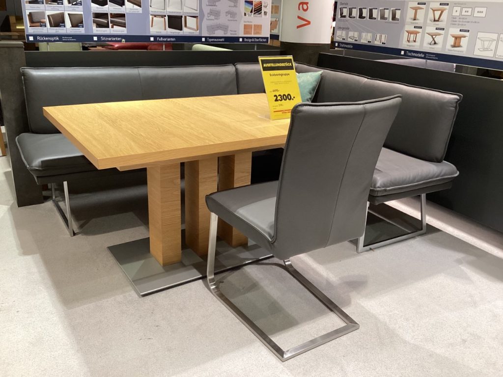 Bemerkung Bezug Leder Bronc88 Fb. Zinn, Eckbank ca. 205 x 158 cm, 2x Schwingstühle, Esstisch Wildeiche natur furniert, ca. 130/178 x 75 x 90 cm, m. Schiebe-/Ansteckplatte, Bodenplatte m. MDF Edelstahldekor