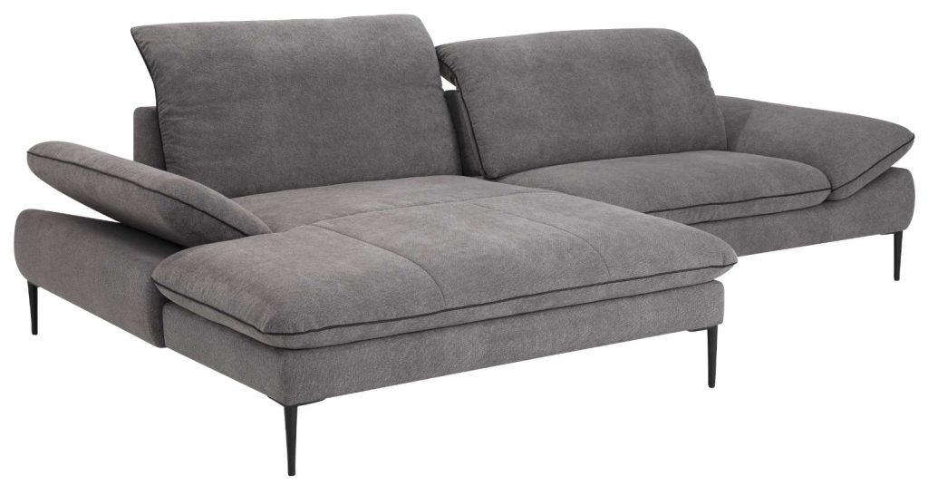 Bemerkung Eckgarnitur in Stoff grey, Sitz Federkern, bestehend aus: Longchair links und Element mit Sitztiefenverstellung rechts, Sitzhöhe ca. 45 cm, legere Polsterung, Stellmaß ca. 185x249 cm.