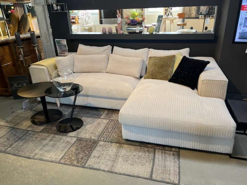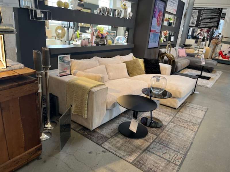 Der helle Cordstoff sorgt für ein gemütliches Ambiente und verleiht dem Raum eine einladende Atmosphäre. Dieses Ausstellungsstück ist nicht nur ein Blickfang, sondern auch fantastisch bequem, um eine entspannte Zeit beim Fernsehen zu verbringen. Inklusive sind sowohl Rückenkissen als auch Lendenkissen, die zusätzlichen Komfort und Unterstützung bieten.