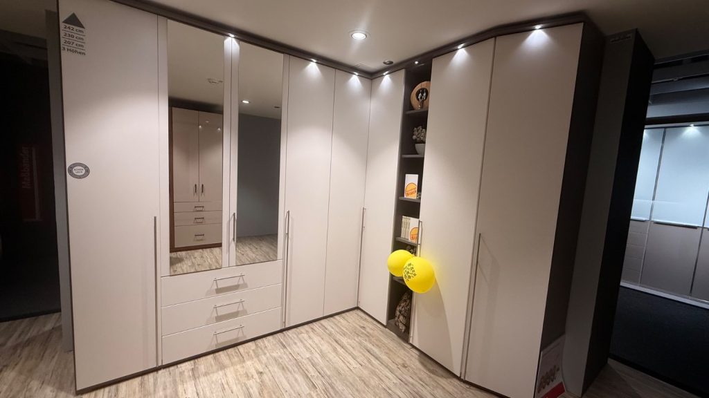 Schenkelmaß x Höhe ca. 282 x 226 x 244 cm Front: Lack Weiß Korpus: Lack Manhattan Griffe: Edelstahl rund Emissionsklasse: A bestehend aus: - 1x Grundelement mit 1 Hotztur links - 1x Kranzleiste 19mm - 1x Power-LED 1er-Set - 1x Anbauelement mit 2 Holztüren - 1x Spiegel über Frontschübe links -1x Spiegel über Frontschübe rechts - 1x Kranzleiste 19mm - 1x Power-LED 1er-Set - 1x Frontschubkasten 90er mit 3 Schubkästen, Griffe Edelstahl rund - 1x Anbauelement mit 1 Holztür rechts - 1x Kranzleiste 19mm - 1x Power-LED 1er-Set