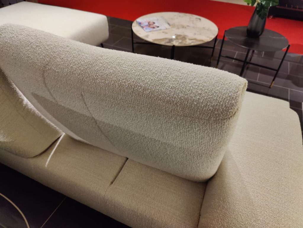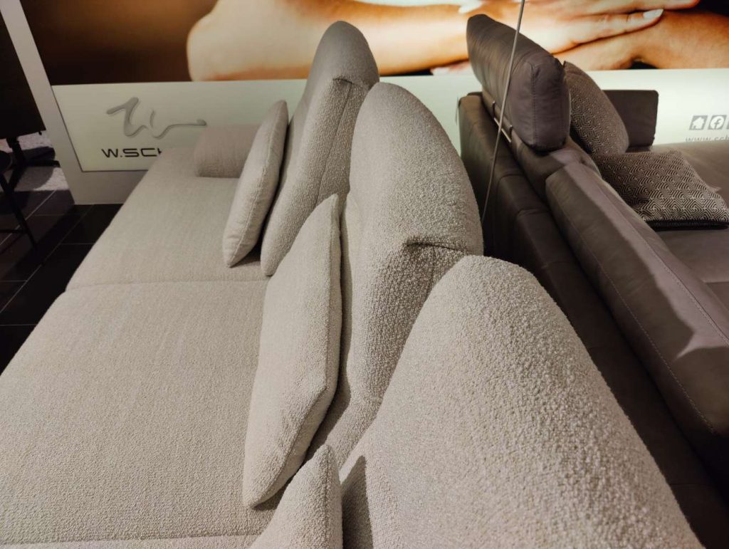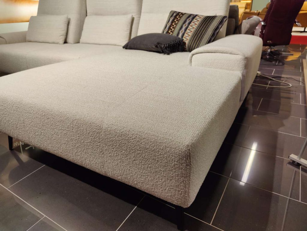 Bemerkung Das Ecksofa Modell 16567 Caroline von SCHILLIG verkörpert modernen Komfort und herausragende Qualität. Mit seiner eleganten Farbe Ivory fügt es sich nahtlos in jedes Wohnambiente ein und wird zum Herzstück Ihres Wohnzimmers. Das Sofa ist aus hochwertigem Bouclé-Stoff gefertigt, der durch seine flauschige Oberfläche zusätzlichen Komfort bietet. Als Ausstellungsware überzeugt es durch seinen exzellenten Sitzkomfort, der durch einen Federkern unterstützt wird, und durch seine verstellbaren Funktionen, die individuellen Anpassungen erlauben. Die praktischen Sitztiefen- und Kopfteilverstellungen ermöglichen ein flexibles und angenehmes Sitzerlebnis, während die im Lieferumfang enthaltenen drei Nierenkissen für zusätzlichen Komfort sorgen. Die robusten schwarzen Metallfüße verleihen dem Sofa nicht nur Stabilität, sondern auch einen modernen Look. Mit großzügigen Abmessungen von 312 x 180 cm bietet das Caroline Ecksofa ausreichend Platz für entspannte Stunden und gesellige Abende. Made in Germany, steht es für zuverlässige Handwerkskunst und Langlebigkeit – eine Investition, die sich lohnt.