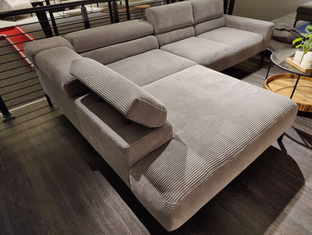 Besonders hervorzuheben ist die inkludierte Kopfteilverstellung, die individuellen Komfort ermöglicht. Ob für entspannte Abende mit einem guten Buch oder Filmnächte, dieses Sofa passt sich Ihren Bedürfnissen an. Die schwarzen Metallfüße sorgen für einen stabilen Stand und setzen einen modernen Akzent.