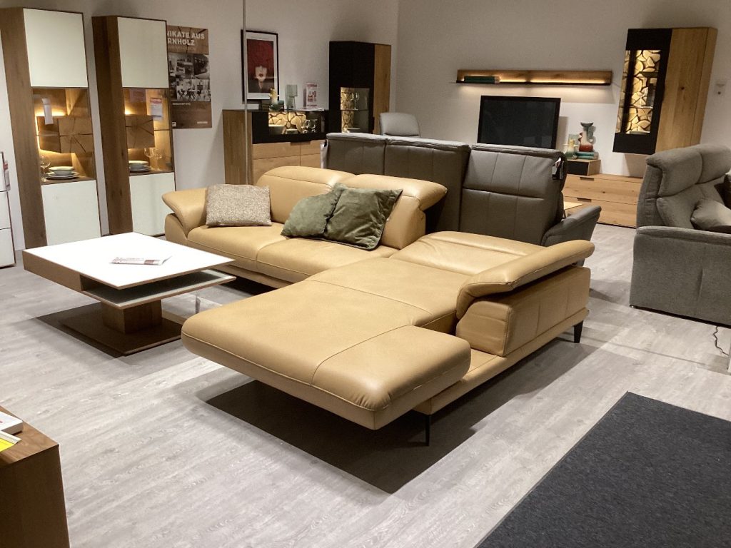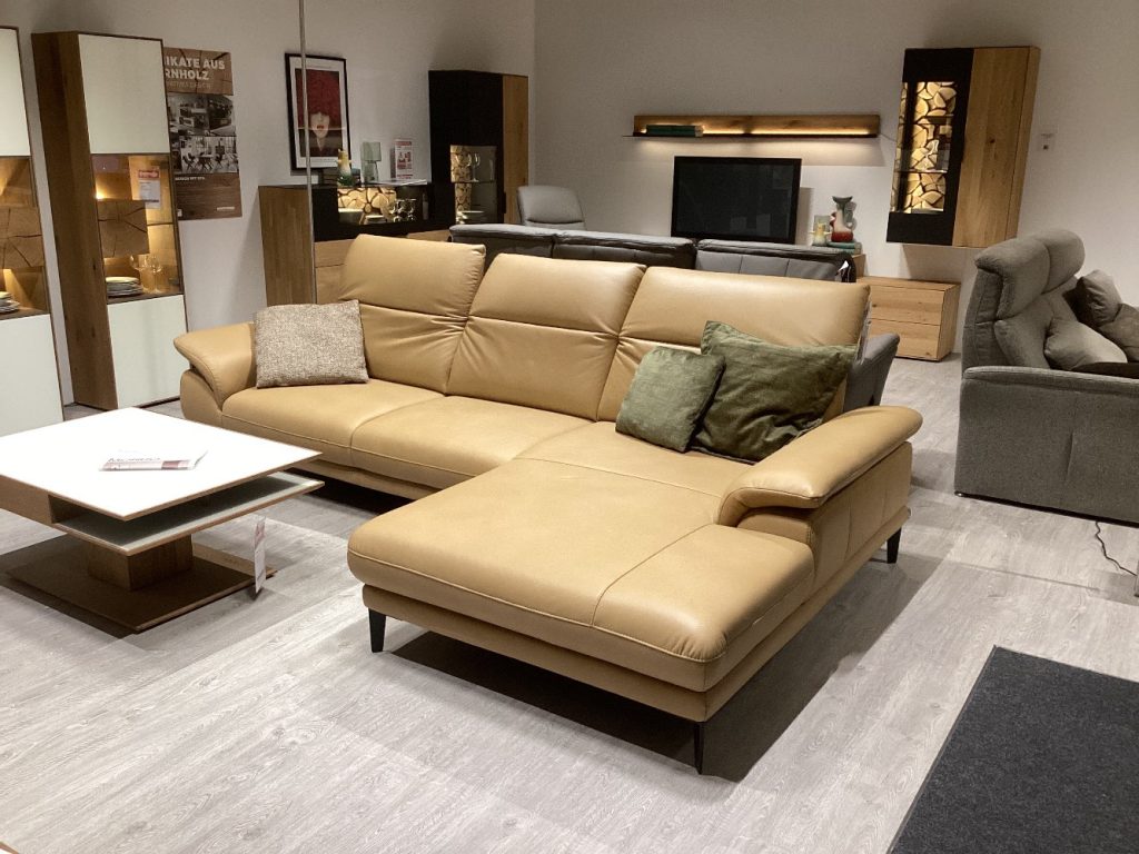 Bemerkung Das Mondo Levias Ecksofa in der eleganten Farbvariante Honey bietet eine perfekte Kombination aus Stil und Funktionalität. Gefertigt aus hochwertigem Echtleder, verleiht es jedem Raum eine luxuriöse Note. Das Modell bietet nicht nur beeindruckende Ästhetik, sondern auch vielseitige Komfortfunktionen. Der motorische Longchair mit Relaxfunktion ermöglicht es Ihnen, sich auf Knopfdruck in eine entspannte Liegeposition zu begeben. Die manuelle Kopfverstellung sorgt dafür, dass Ihr Kopf stets optimal gestützt wird, während die Armteilverstellung zusätzlichen Komfort bietet. Mit den Maßen von ca. 308/195 cm passt das Sofa ideal in geräumige Wohnbereiche und wird zum Mittelpunkt Ihres Zuhauses. Die schwarzen Metallfüße verleihen dem Sofa einen modernen Touch und ergänzen das stilvolle Design. Als Ausstellungsware steht das Mondo Levias Ecksofa für Qualität und exquisite Handwerkskunst, bereit, Ihren Wohnraum in eine Oase der Entspannung zu verwandeln.