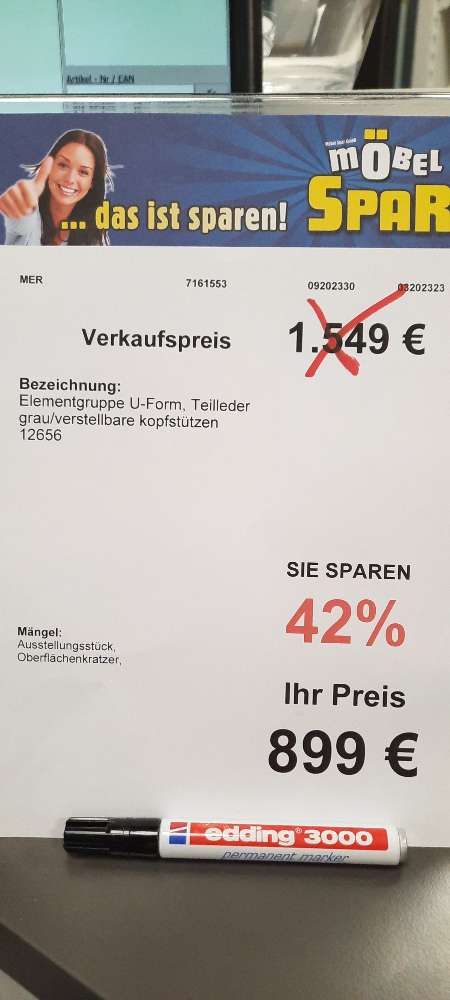 Bemerkung Hierbei handelt es sich um ein Angebot von Möbel Spar Standort des Artikels ist Merseburg Details wie technische Daten (Maße etc.) oder Schäden entnehmen Sie dem Bild mit Preis. RESERVIERUNG: Bei einem längeren Anfahrtsweg und vorheriger Absprache mit der Verkäuferin vor Ort ist eine Reservierung, für die Dauer der Fahrt maximal jedoch für 4 Stunden möglich. Von Sonderanfragen bitten wir abzusehen. Versand: Grundsätzlich bieten wir keinen Versand unserer Artikel an. Aufgrund von meist vorhandenen kleineren bis größeren Mängeln, ist ein Fernabsatzgeschäft nicht möglich. Da der Kunde die Mängel selbst vor Ort und Kauf sehen und dafür unterschreiben muss. Bei Kleinartikeln im Deko Bereich oder Restpostenbereich besteht ggf. die Möglichkeit fragen Sie uns hierzu einfach an. Transport: Wir selbst bieten keine direkten Zufuhren / Lieferungen an, haben aber in jeder Filiale Minimum einen externen Anbieter der dies für uns übernimmt. Die Kontaktdaten geben wir bei Interesse gerne weiter. Aus Haftungsgründen ist dies ein Fremdgeschäft und wird zwischen dem Kunden und dem Transportunternehmen getroffen und ist unabhängig von der Möbel Spar GmbH. Umlagerung: Sie haben einen Artikel entdeckt welcher in einer anderen Filiale als Ihre nächstgelegene lagert? Kein Problem, wir bieten eine interne Umlagerung an. In diesem Fall muss der Kunde eine Anzahlung in dem Abholmarkt tätigen. Je nach Größe und Aufwand kann eine individuelle Transfergebühr berechnet werden. Der Kauf ist keine Pflicht, es wird aber bei Nichtgefallen und Wegfall des Verkaufes eine pauschale Bearbeitungsgebühr in Höhe von 15€ einbehalten, ebenso die ggf. angefallene Transfergebühr. WICHTIG: Bitte telefonisch erfragen ob der Wunschartikel noch verfügbar ist. Zwischenverkauf vorbehalten. Die Besichtigung, der Verkauf und die Abholung erfolgt ausschließlich bei unserem Handelspartner: MÖBEL SPAR GmbH 06217 Merseburg , Klobikauer Str.14( Einfahrt über Geusaer Str.15) Ihre Ansprechpartner Frau Reimann , Frau Jenske oder Frau Lärche erreichen Sie telefonisch unter 0176-578 90 762 bzw. 03461-2756990 Öffnungszeiten : MO-FR 10:00-19:00 Uhr, SA 10:00 – 16:00 Uhr Alle Inserate sind unverbindlich. Preisirrtümer und Änderungen vorbehalten. Abbildung ähnlich. Mehrere Rabattaktionen sind nicht kombinierbar. Weitere sichtbare Artikel können bei Verfügbarkeit zusätzlich erworben werden Vielen Dank das Sie auf unserer Seite gelandet sind, besuchen Sie unseren Shop um weitere spannende Artikel zu finden.