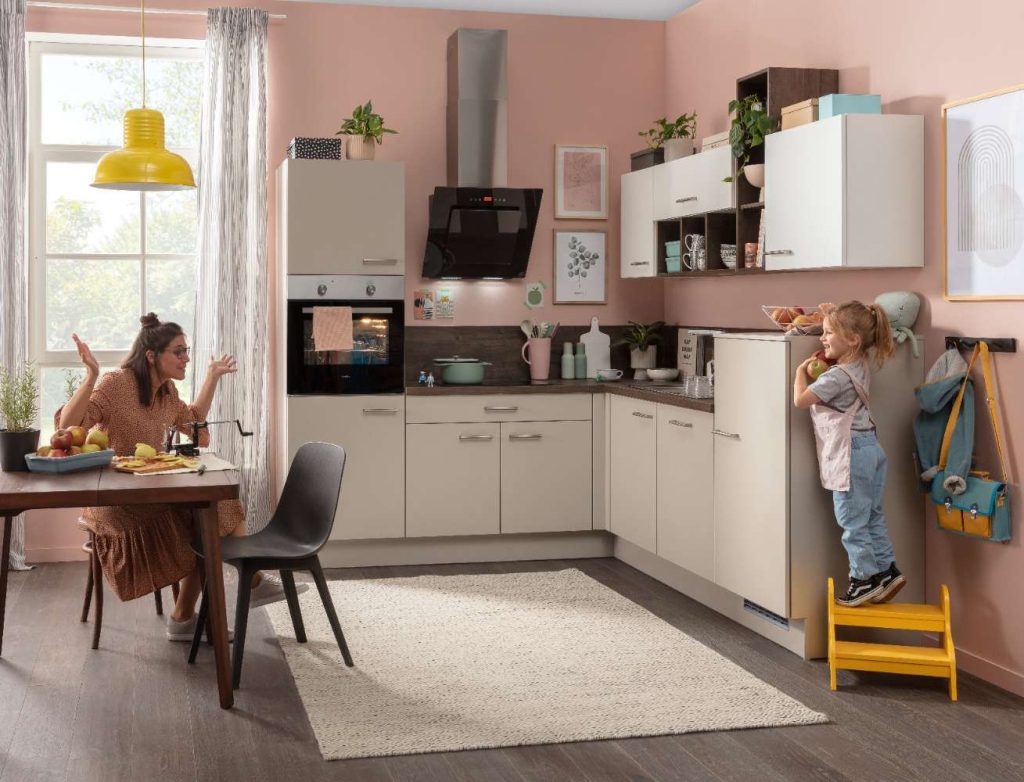 Front und Korpus in Kieselgrau und Weiß, Arbeitsplatte Oregon Eiche-Nachbildung. Stellmaß: ca. 225x245cm. Geschirrspüler nach Wahl gegen Mehrpreis.