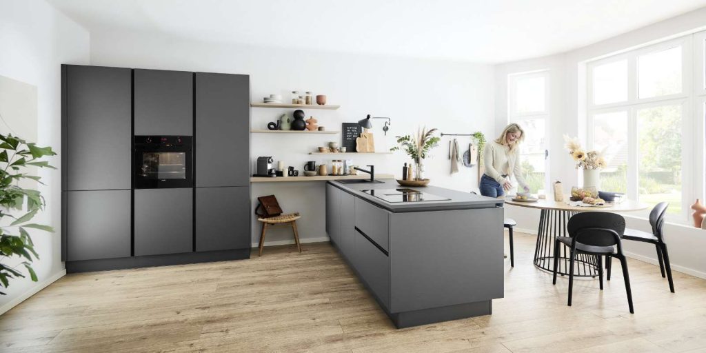 Front in Graphit matt, Korpus in Graphit, Arbeitsplatte in Graphit PRO.